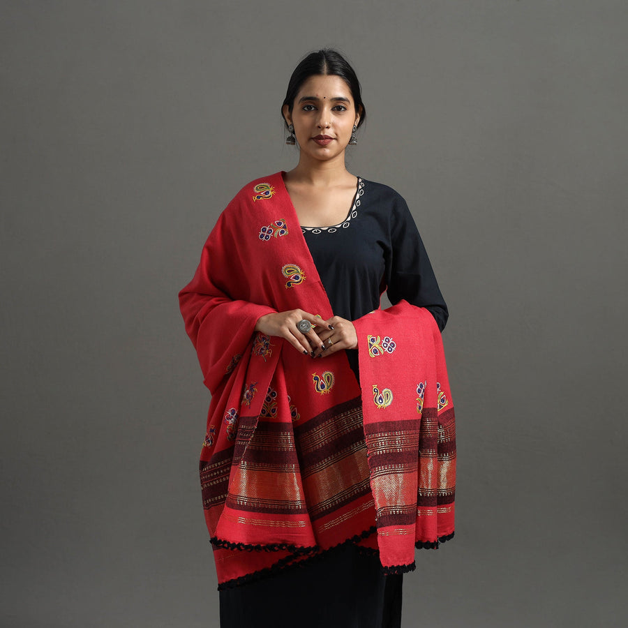 | Material | Allover red kutch ahir hand embroidery woollen shawl. Crafted by artisans in Gujarat, this shawl features zari, mirror work and Kutchi weaving motifs. The acrylic wool ensures warmth and comfort |