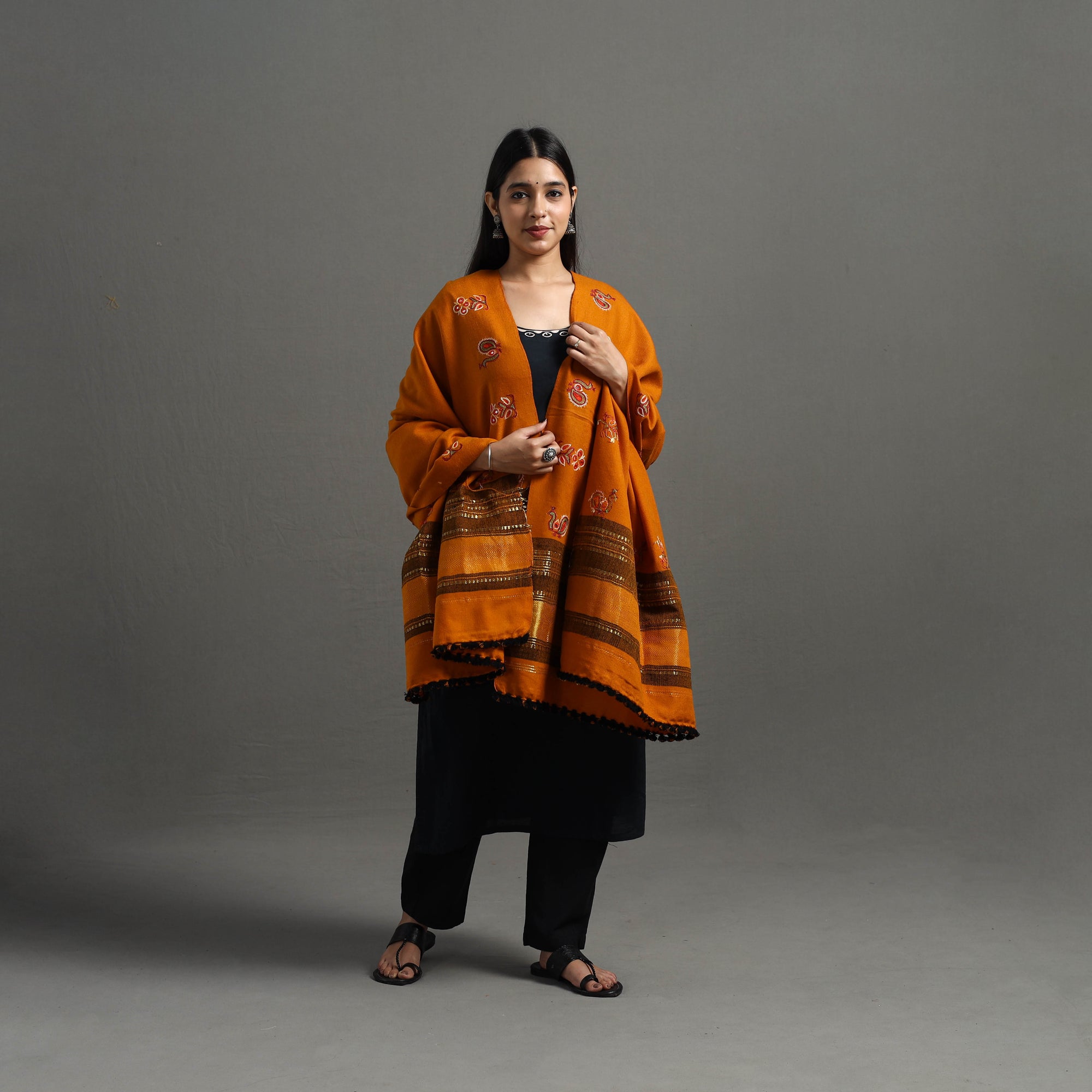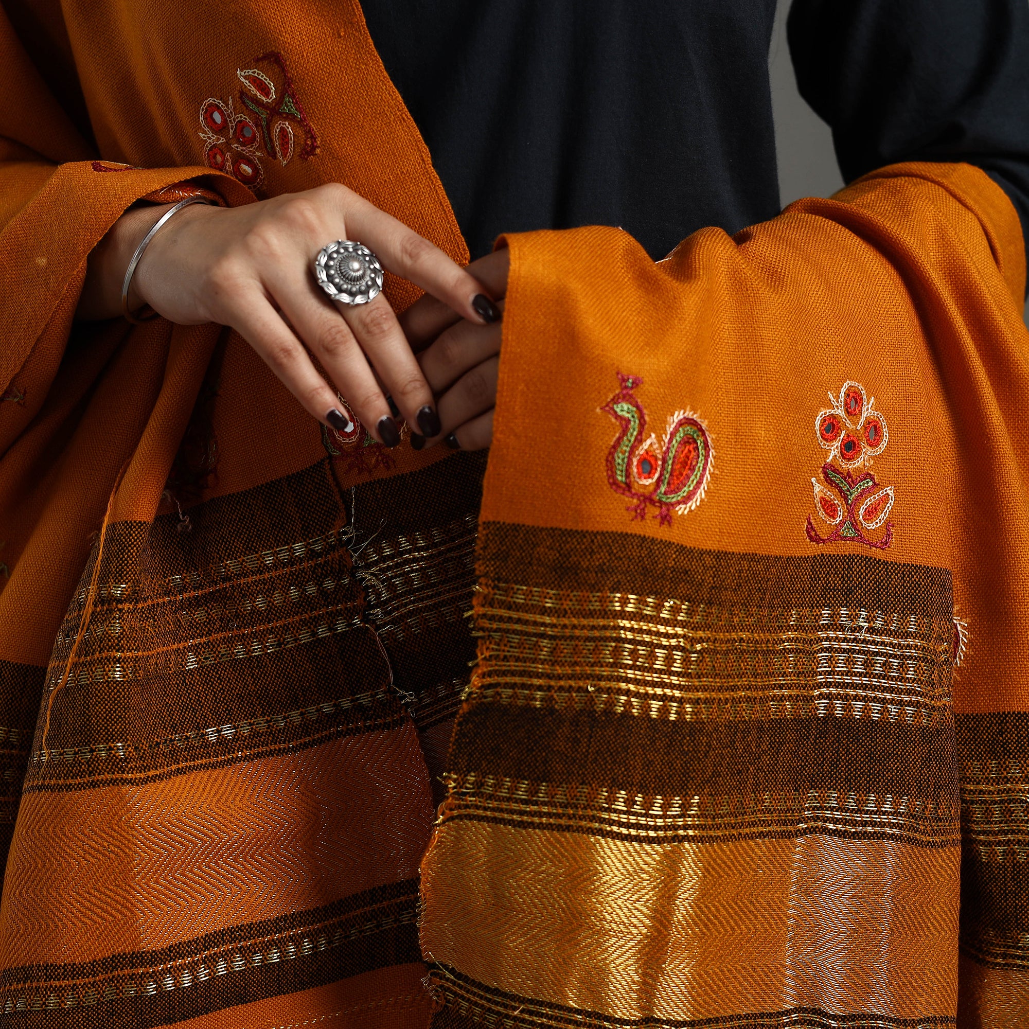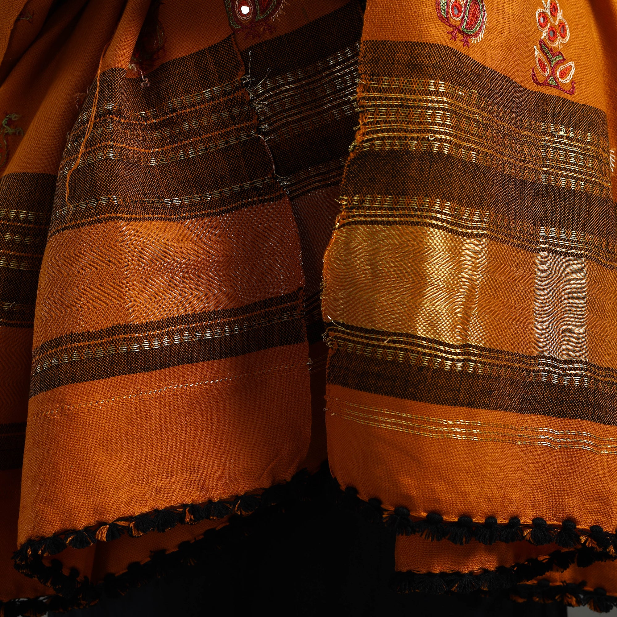 Allover orange kutch ahir hand embroidery woollen shawl. Crafted by artisans in Gujarat, this shawl features zari, mirror work and Kutchi weaving motifs. The acrylic wool ensures warmth and comfort