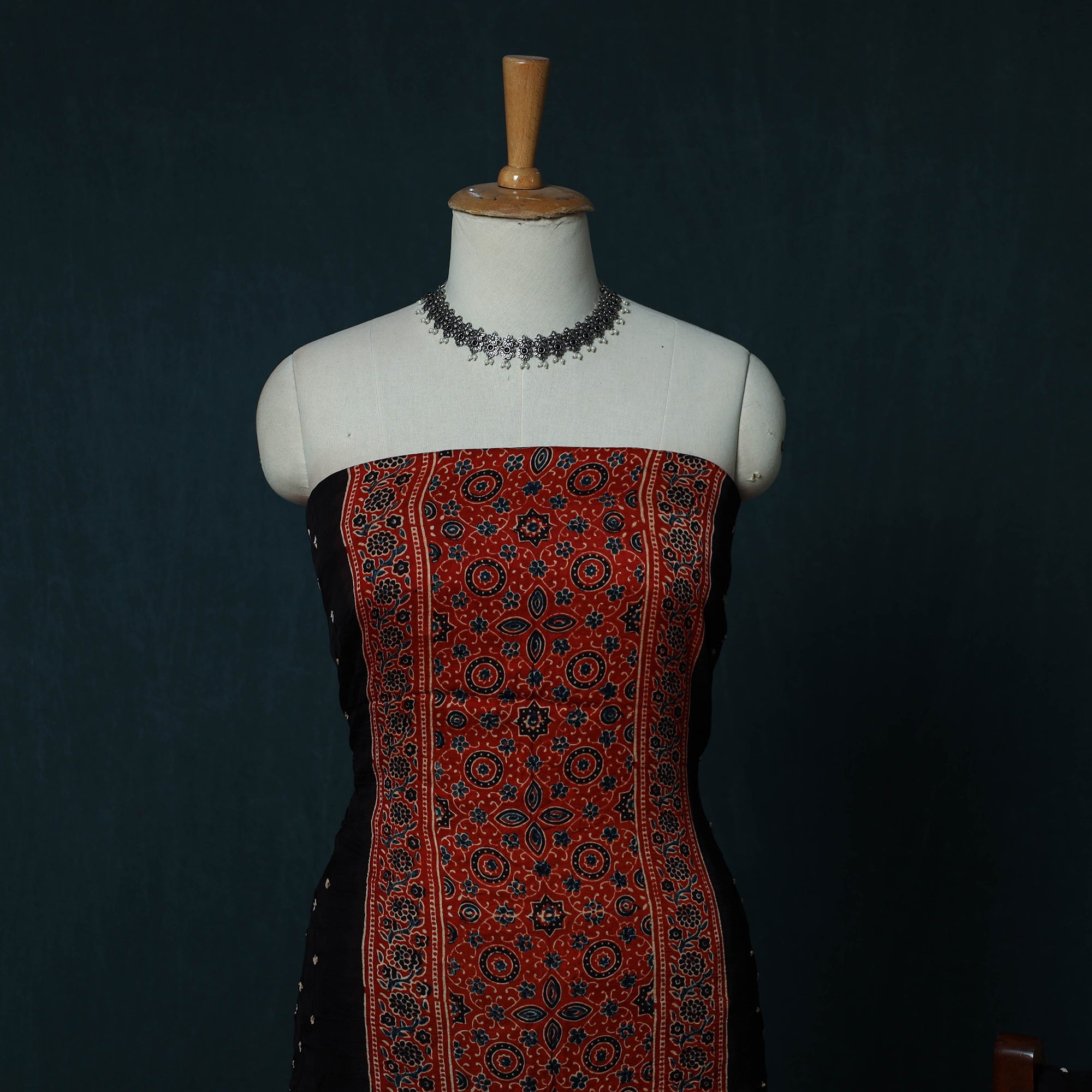 Kutch ajrakh bandhani tie-dye modal silk 3pc unstitched dress material suit set comes from Kutch, Gujarat, known for its rich textile traditions. This piece is made by skilled master artisan Shabana Khatri. It features two age-old techniques bandhani and ajrakh block printing. In Bandhani, small sections of fabric are tightly tied before dyeing to create fine dotted patterns. Ajrakh involves a detailed process of hand block printing in multiple stages, creating layered geometric and symmetrical patterns. Made in modal silk, the set includes fabric for kurta, bottom and dupatta with a Lagdi Patta border. It can be tailored into various styles like straight suits, anarkali, or fusion wear, making it suitable for occasions as well as refined everyday outfits.