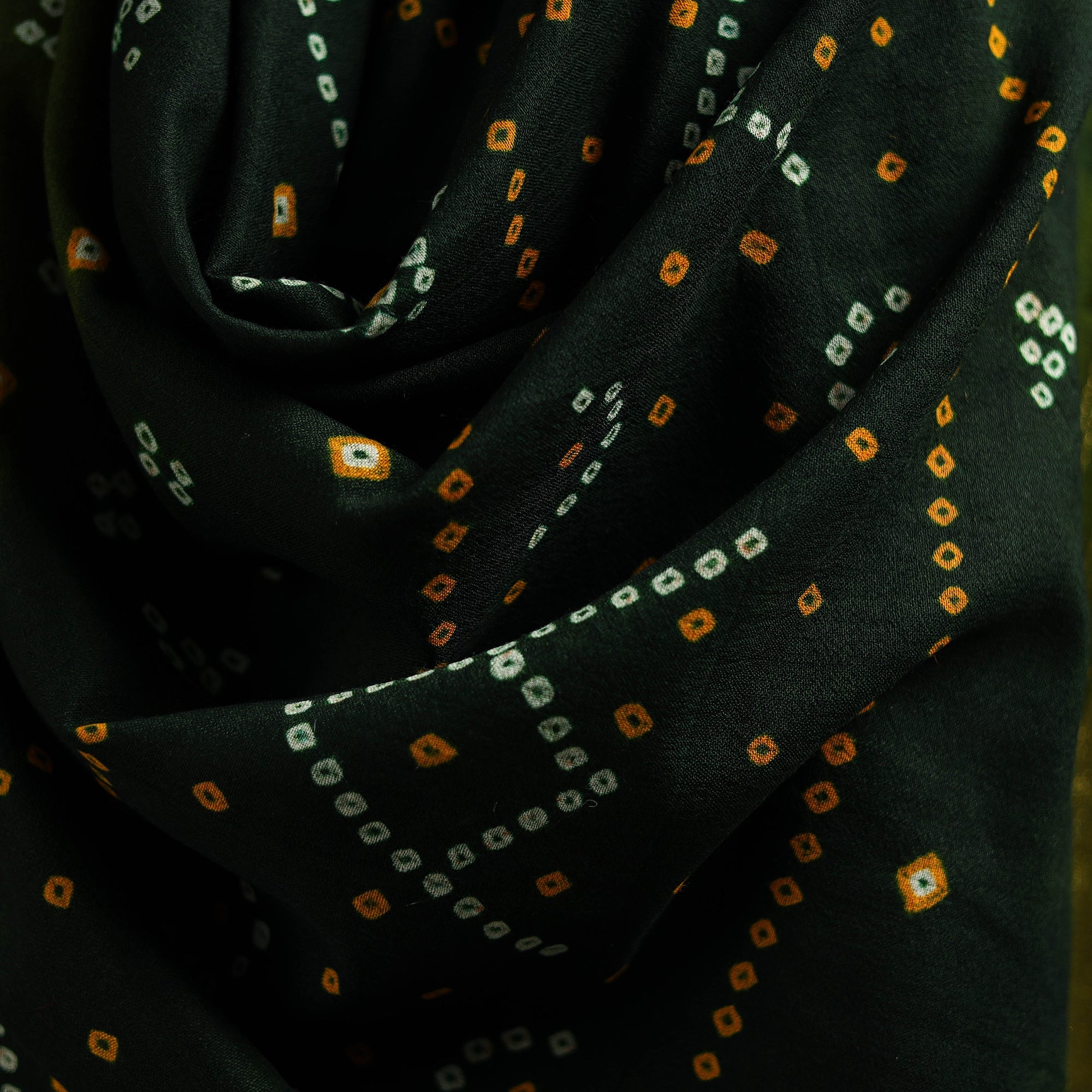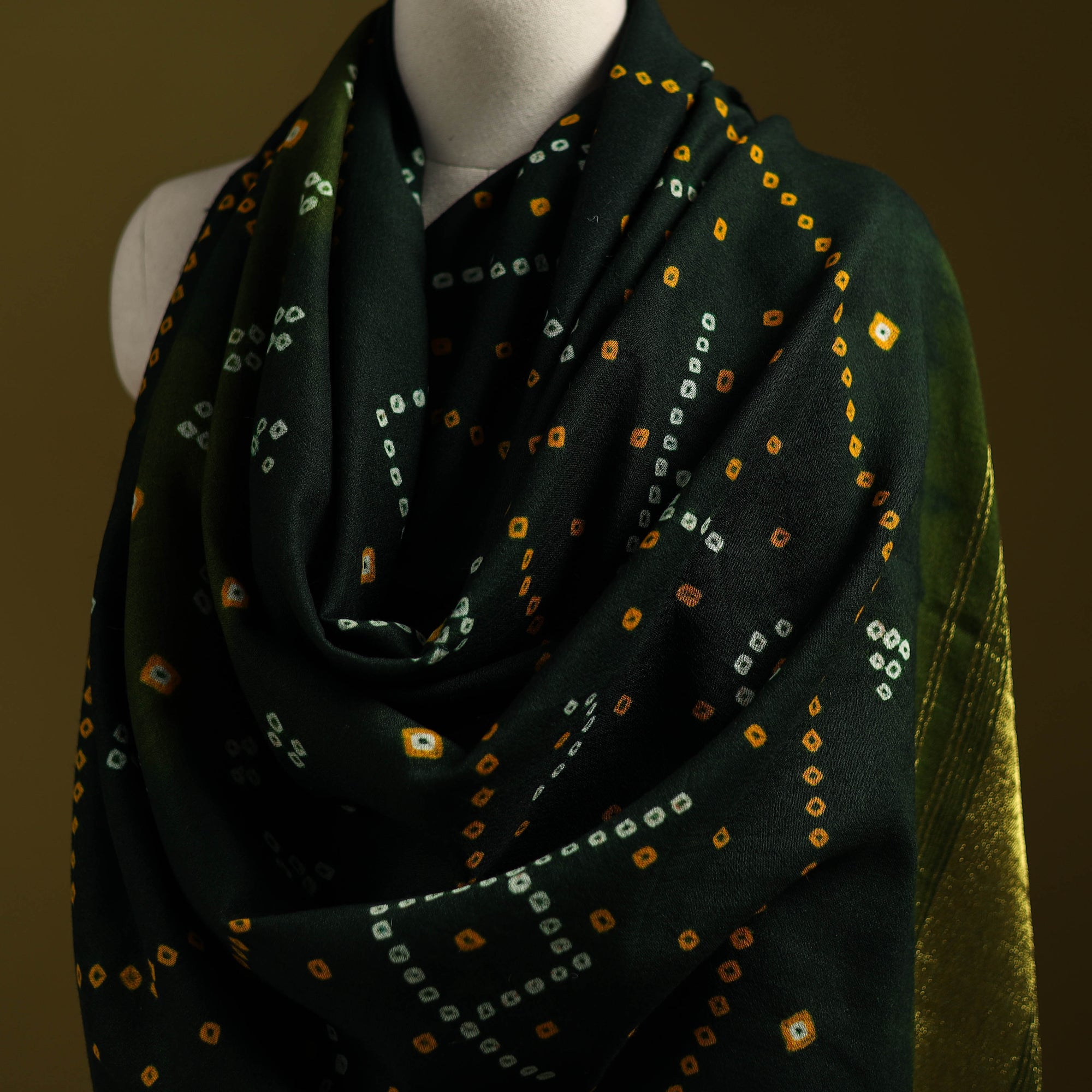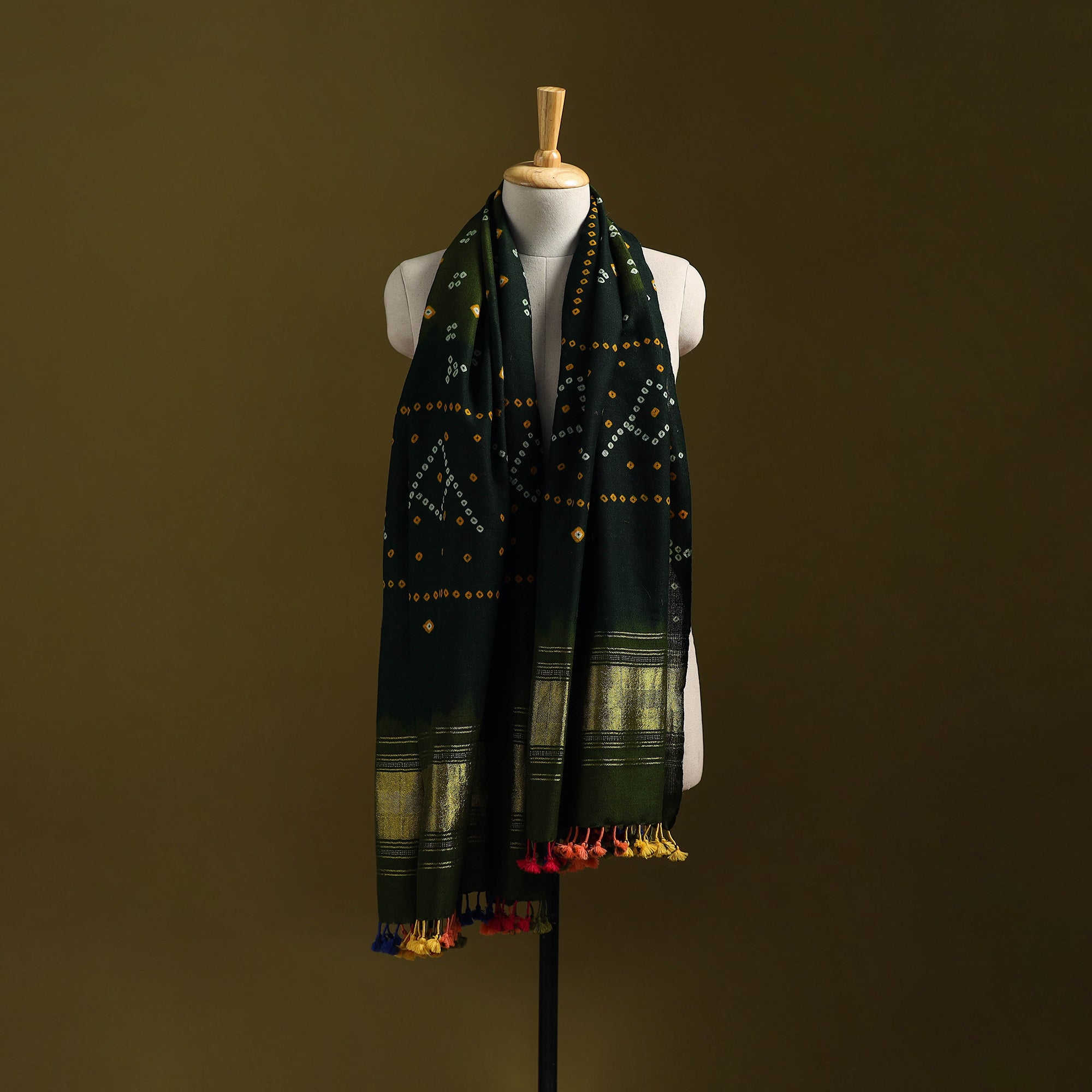 Green kutch bandhani tie-dye handwoven shawl crafted by skilled artisan Vankar Bhimji Kanji from Bhuj Gujarat. Adorned with zari patta and tassle. Made from merino wool it offers both warmth and comfort. A perfect blend of tradition and style ideal for winter wear.