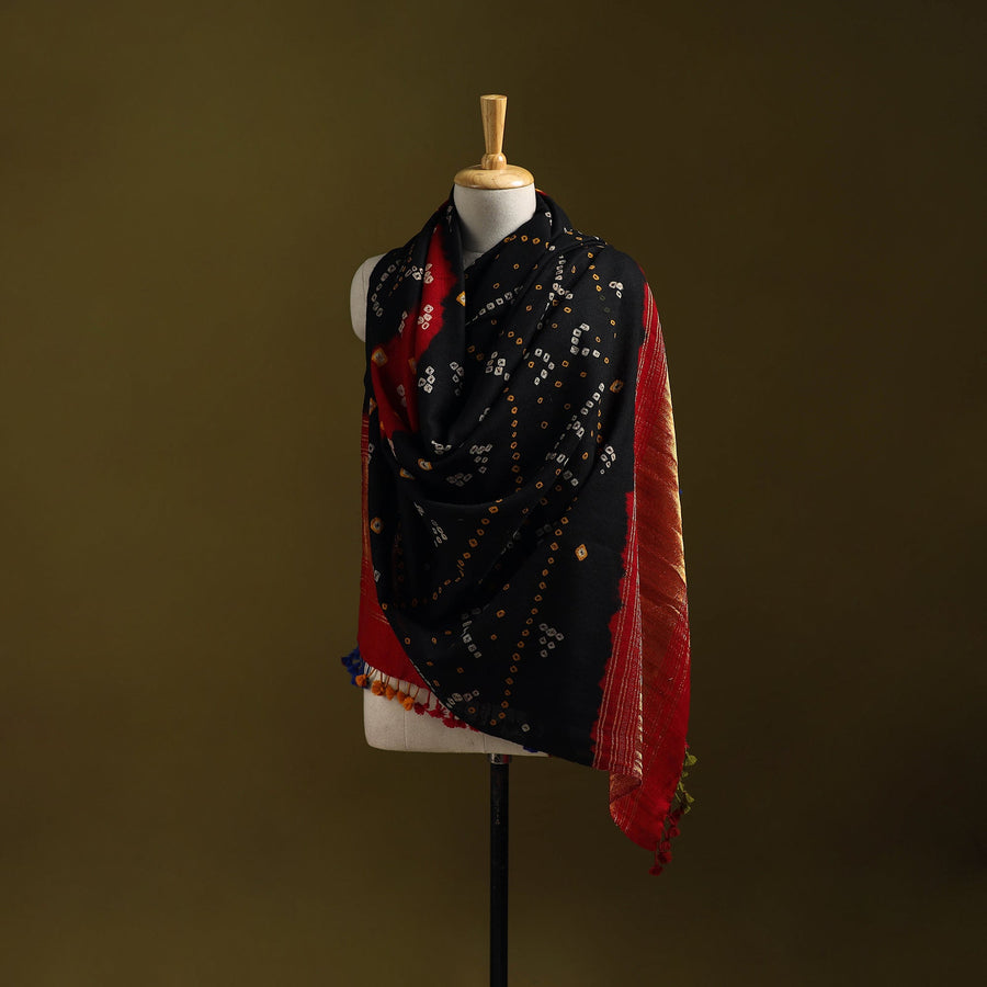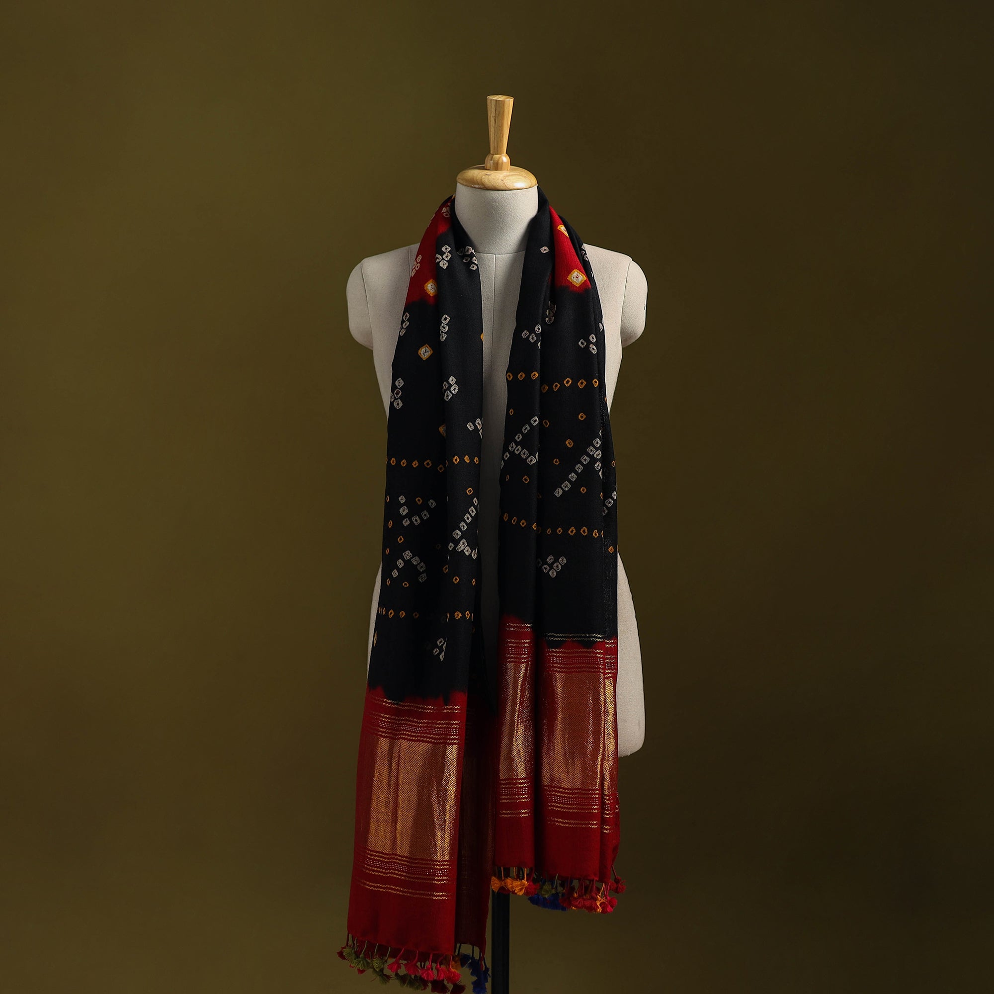 Black kutch bandhani tie-dye handwoven shawl crafted by skilled artisan Vankar Bhimji Kanji from Bhuj Gujarat. Adorned with zari patta and tassle. Made from merino wool it offers both warmth and comfort. A perfect blend of tradition and style ideal for winter wear.