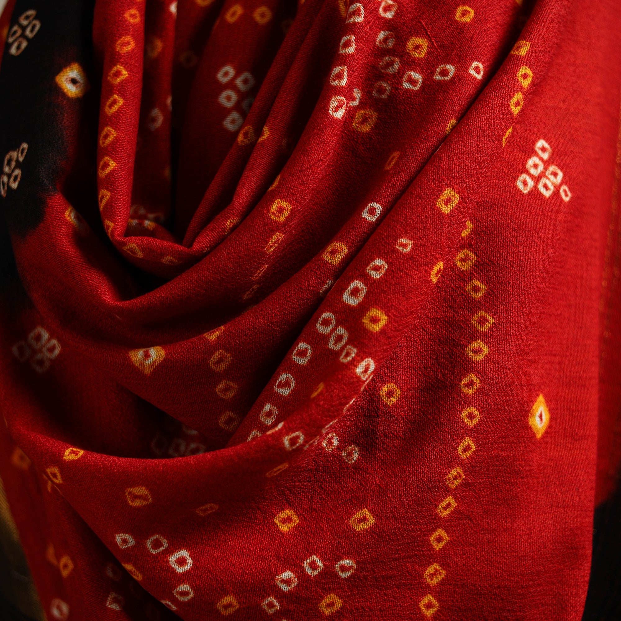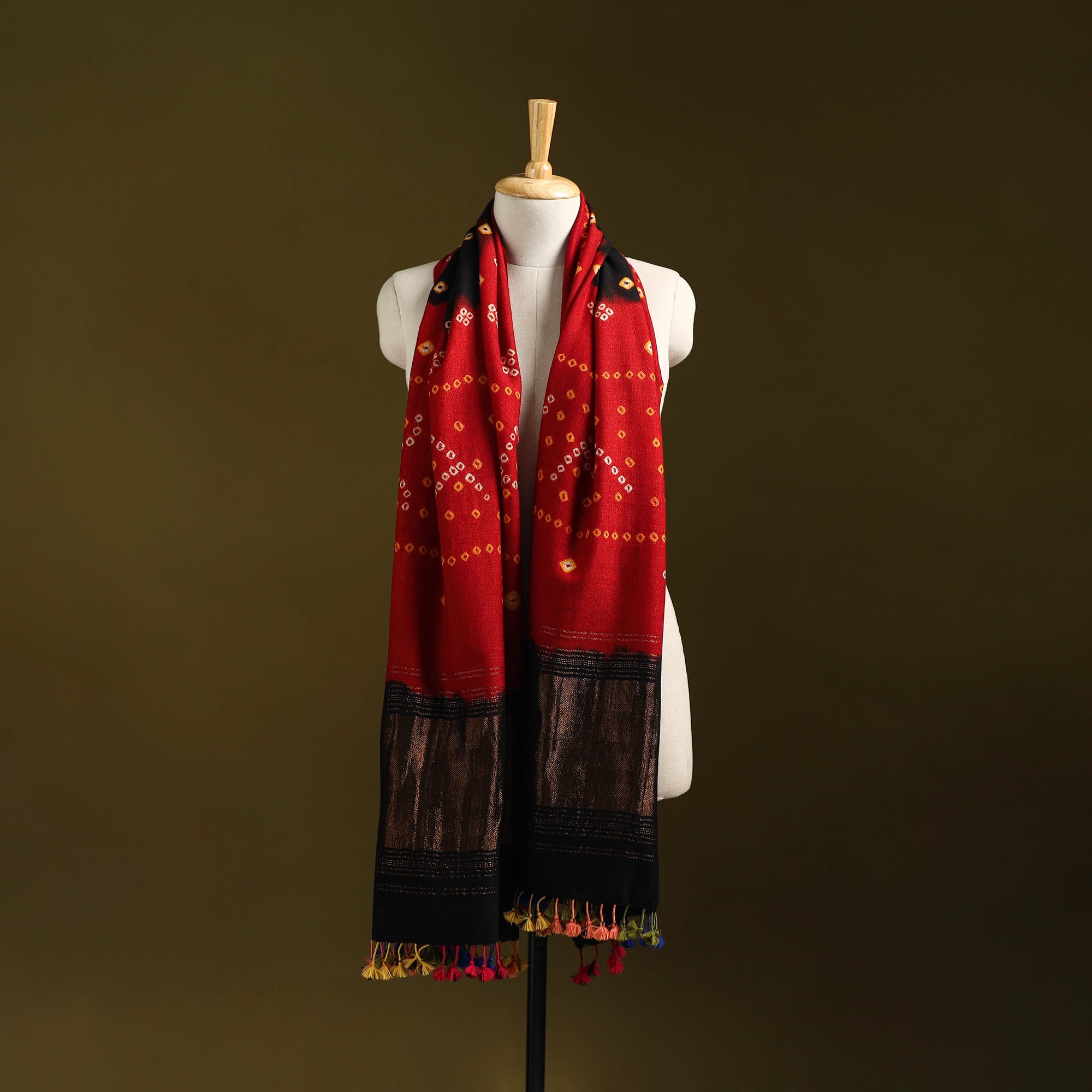 | Material | Red handwoven bandhani tie-dye merino wool shawl carries the rich artistry of Kutch, Gujarat. Crafted by skilled artisans under the guidance of the renowned Vankar Bhimji Kanji, it features a delicate zari patta that adds a subtle charm. Blending traditional appeal with a contemporary sensibility. It adds a graceful touch to your everyday look or festive ensemble and also offers comforting warmth, making it a lovely choice for chilly days. |