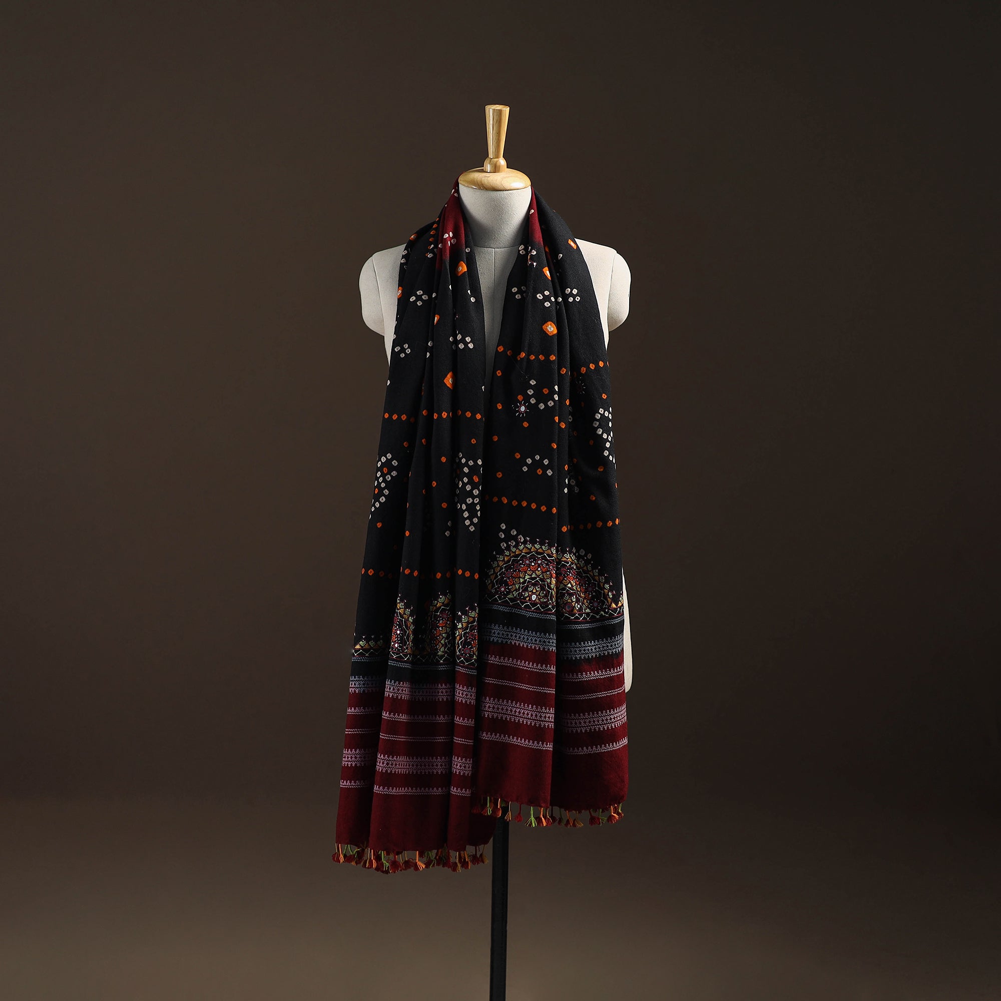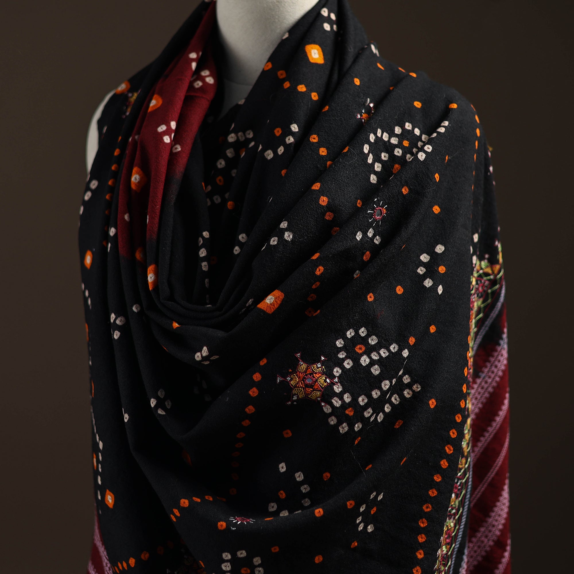 | Material | Black kutch bandhani tie-dye handwoven shawl crafted by skilled artisan Vankar Bhimji Kanji from Bhuj Gujarat. Adorned with intricate Kutchi motifs, mirror work, neran hand embroidery and tassle. Made from merino wool wool it offers both warmth and comfort. A perfect blend of tradition and style ideal for winter wear. |
