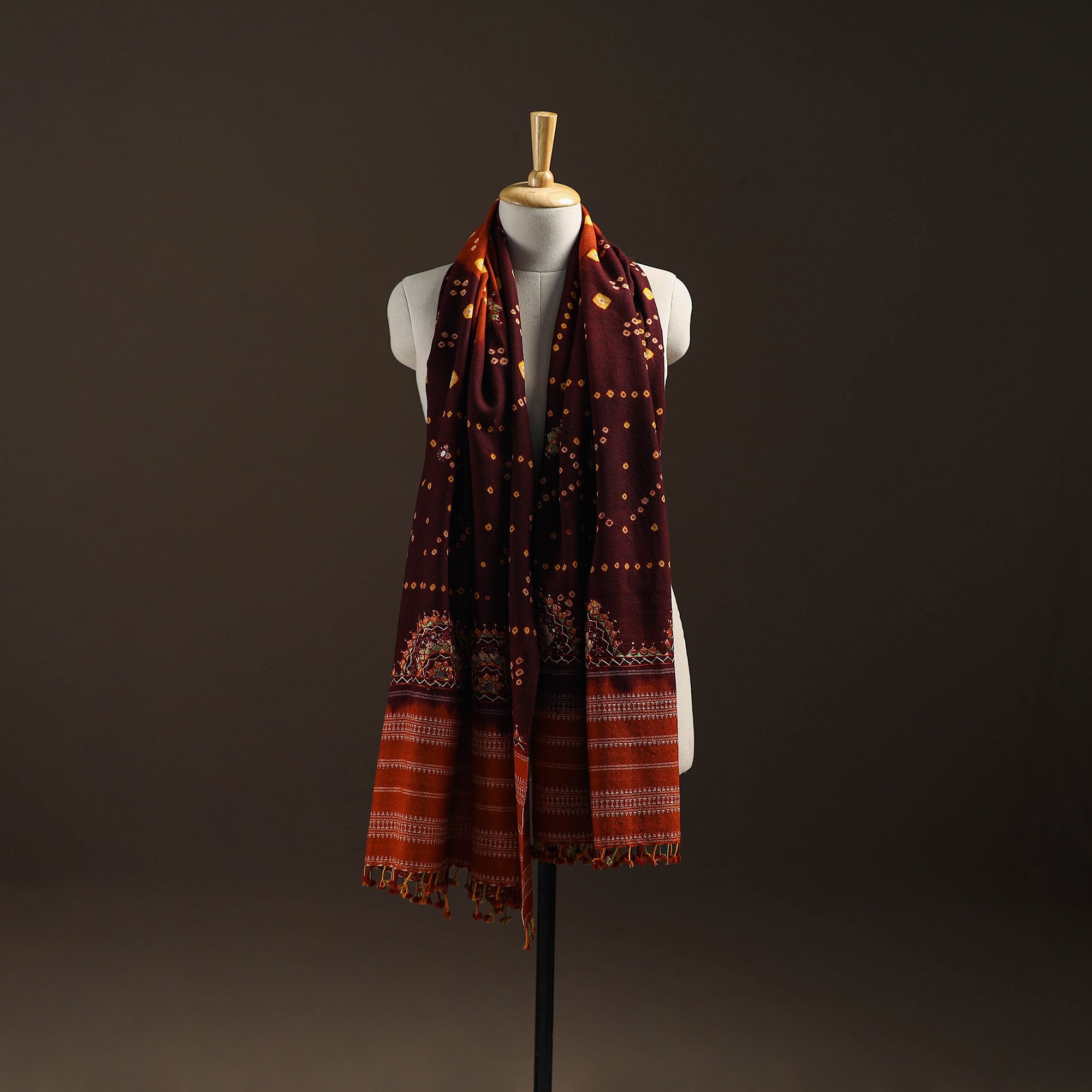 Kutch bandhani tie-dye handwoven shawl crafted by skilled artisan Vankar Bhimji Kanji from Bhuj Gujarat. Adorned with intricate Kutchi motifs, mirror work, neran hand embroidery and tassle. Made from merino wool wool it offers both warmth and comfort. A perfect blend of tradition and style ideal for winter wear.