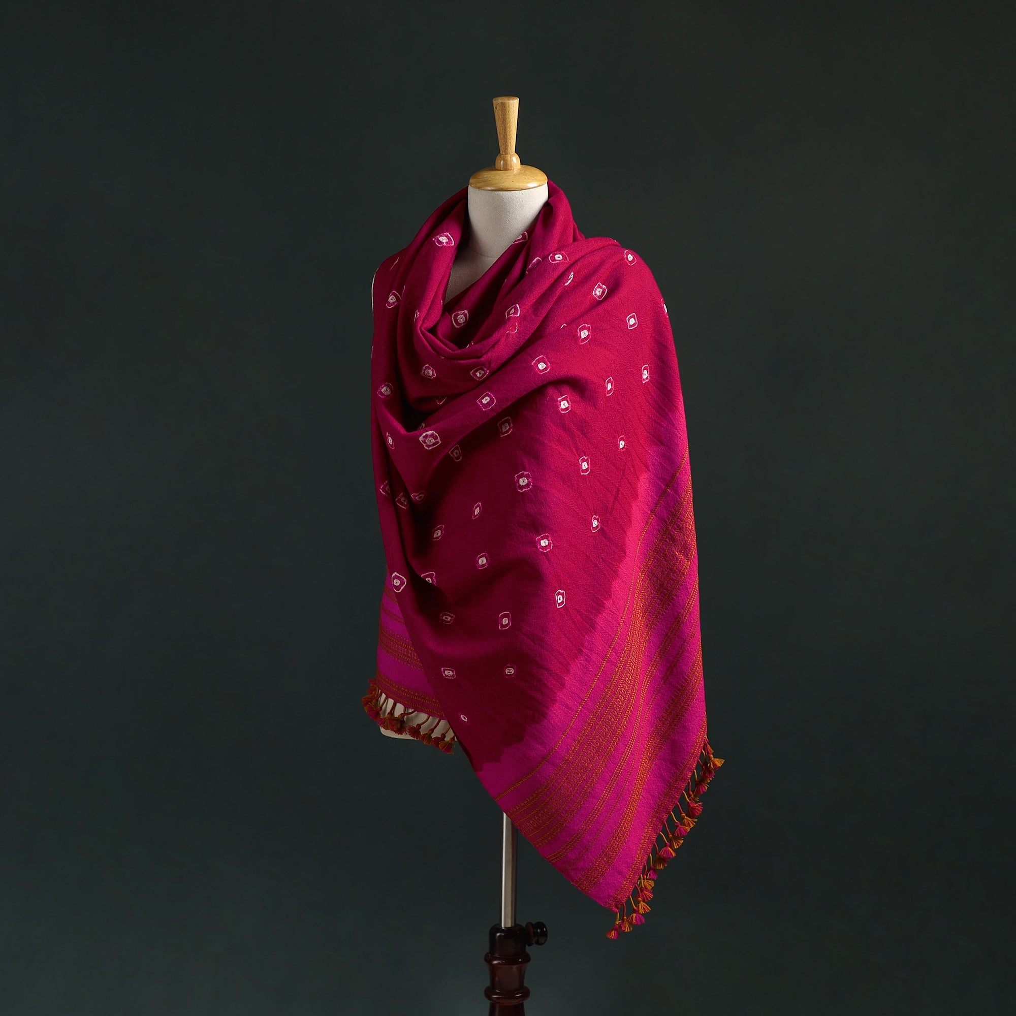 | Material | Experience the elegance of Kutch bandhani tie-dye Merino wool shawl by artisan Vinay Siju from Bhuj, Gujarat. Beautifully handwoven bandhani is a traditional tie-dye technique where the fabric is intricately tied into tiny knots before dyeing, creating distinctive dotted patterns unique to each piece. Featuring Kutchi motifs and delicate tassels, this shawl blends cultural detail with contemporary style. Made from Merino wool, it provides reliable warmth and comfort, making it perfect for everyday wear or special outings. |