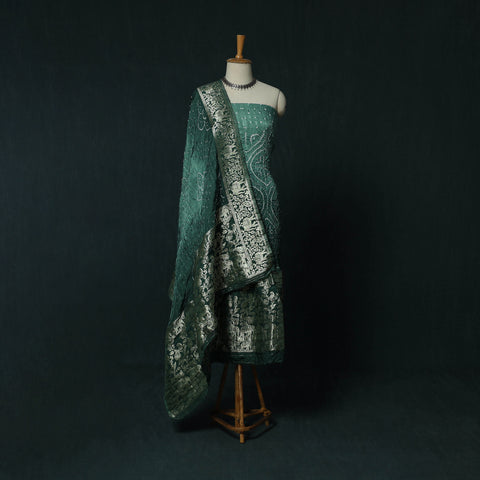 | Material | Kutch bandhani tie-dye modal silk heavy banarasi zari 3pc unstitched dress material suit set comes from Kutch, Gujarat, known for its rich textile traditions. This piece is made by skilled master artisan Shabana Khatri. It features two age-old techniques bandhani and banarasi zari work. In Bandhani, small sections of fabric are tightly tied before dyeing to create fine dotted patterns. After dyeing, Banarasi zari work is added using delicate metallic threads, giving the fabric a soft sheen and detail. Made in modal silk, the set includes fabric for kurta, bottom and dupatta. It can be tailored into various styles like straight suits, anarkali or fusion wear, making it suitable for occasions as well as refined everyday outfits. |