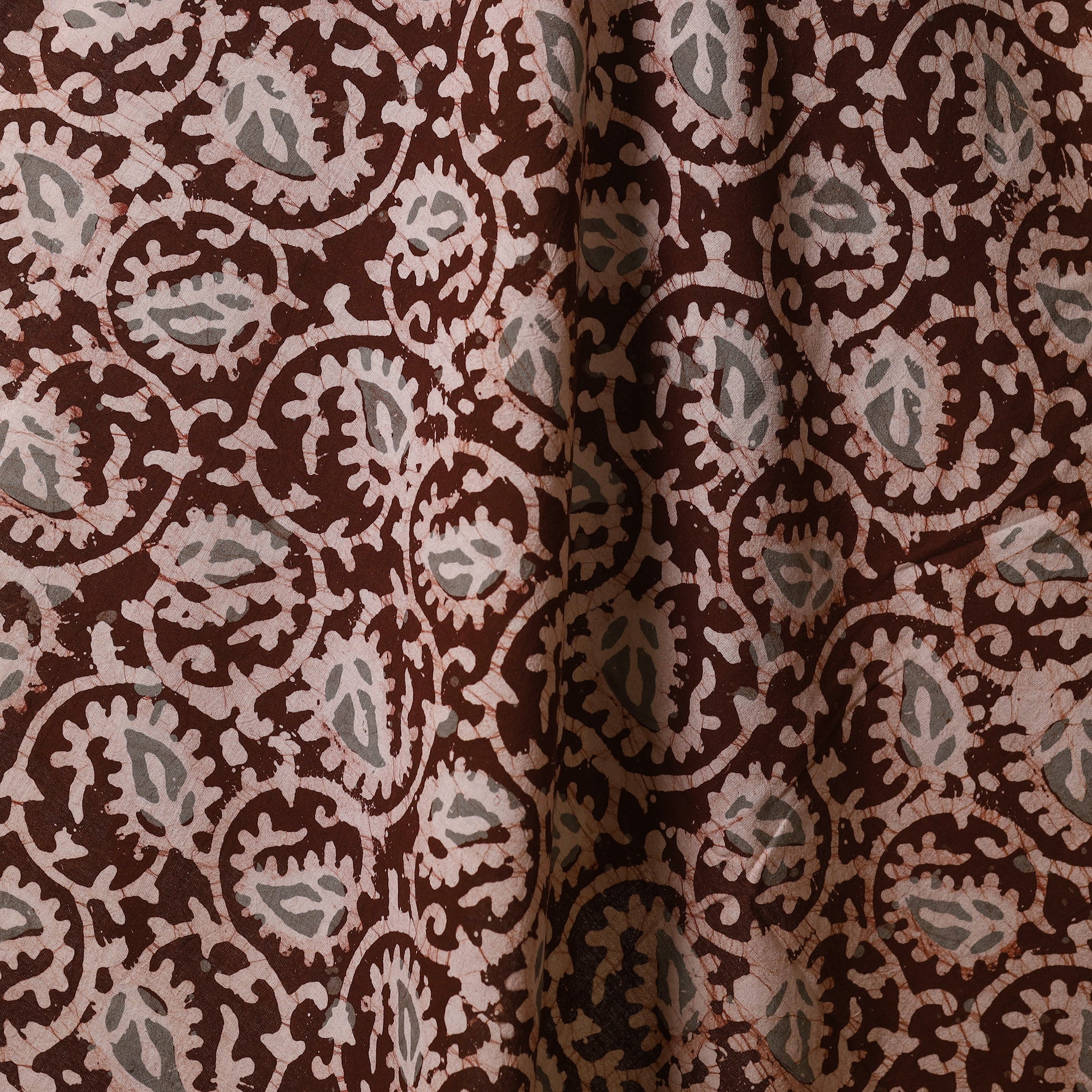 This brown Kutch batik fabric is created using the centuries-old wax resist dyeing method, where molten wax is applied before dyeing to form intricate motifs. Crafted in breathable cotton, it blends durability with comfort, making it perfect for ethnic wear, casual outfits, or decor projects.