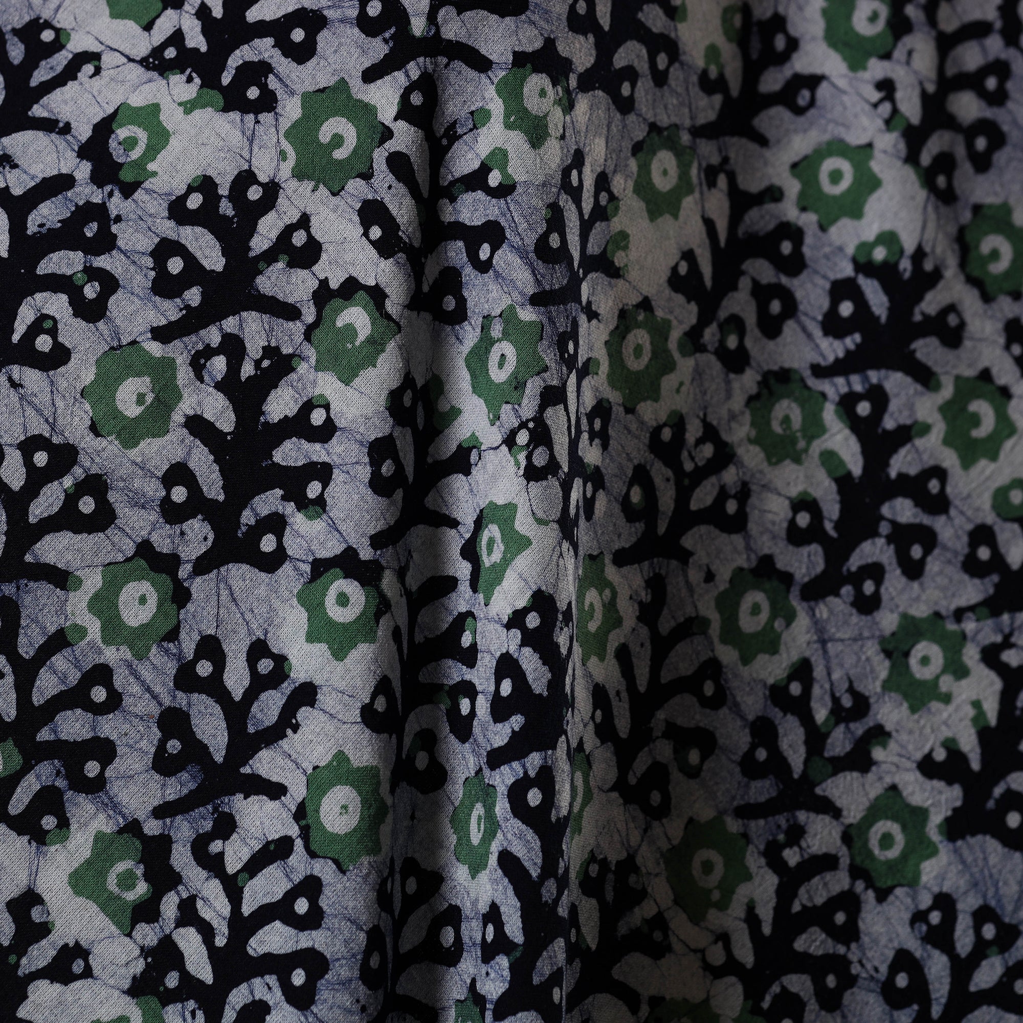 This blue hand batik print fabric from Kutch, Gujarat, is made using the age-old wax-resist dyeing method, where hot wax is applied to the cloth before dyeing to create detailed patterns. Woven in breathable cotton, it offers a perfect blend of durability and comfort, making it suitable for ethnic wear, casual ensembles, or creative home décor projects.
