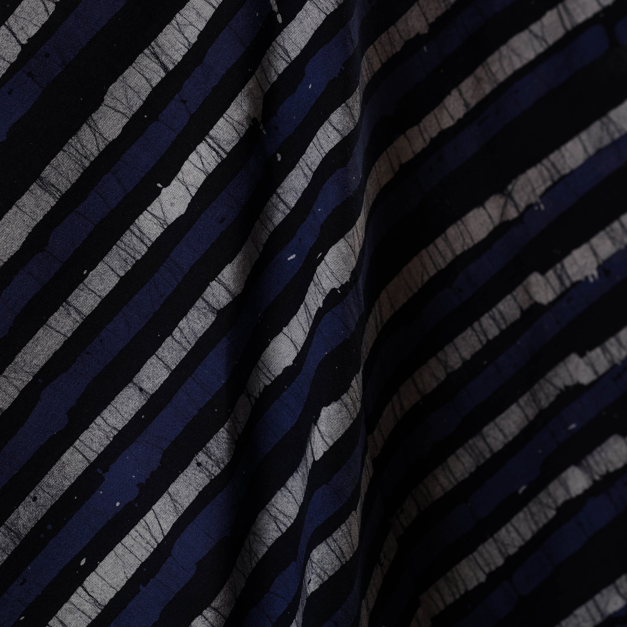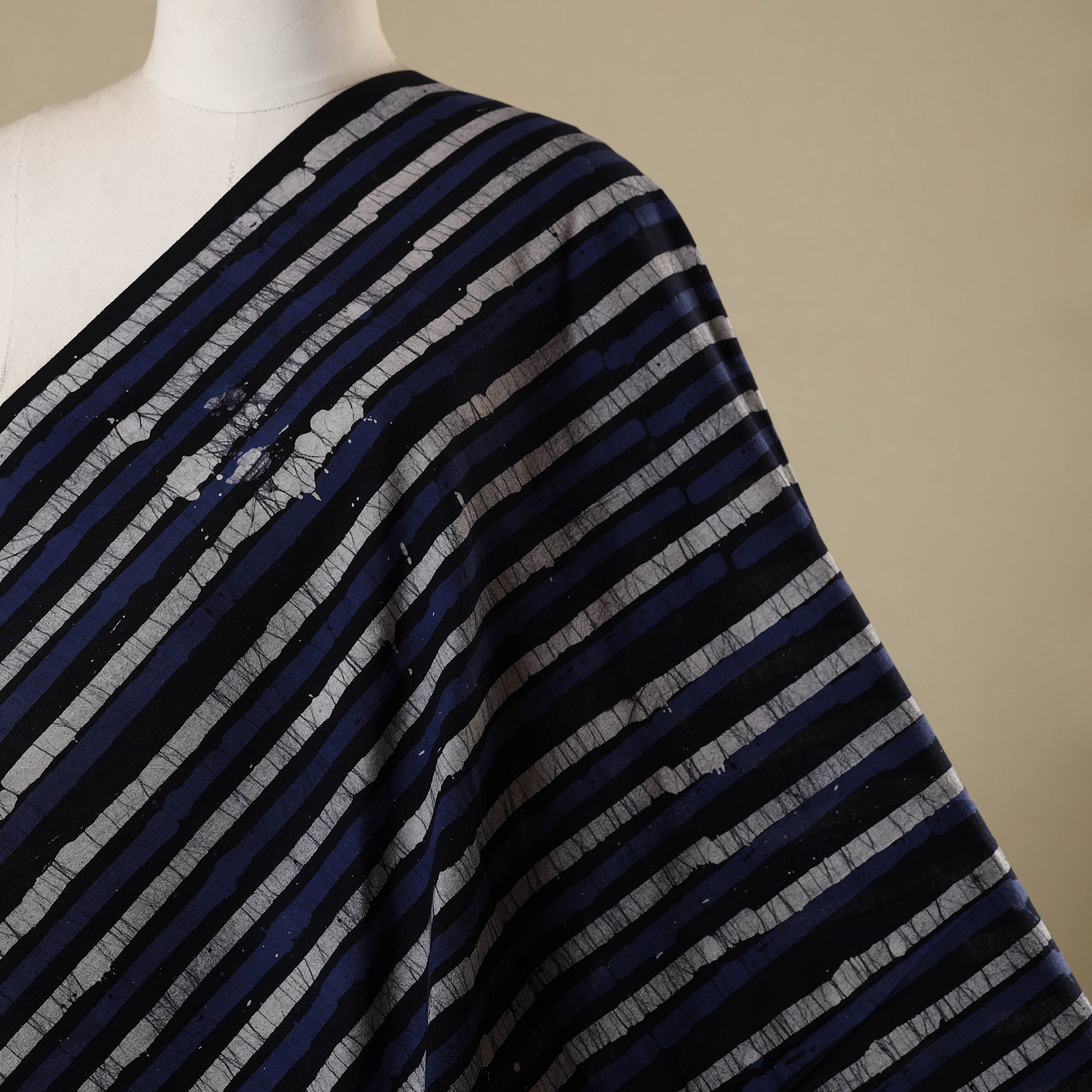 This blue hand batik print fabric from Kutch, Gujarat, is made using the age-old wax-resist dyeing method, where hot wax is applied to the cloth before dyeing to create detailed patterns. Woven in breathable cotton, it offers a perfect blend of durability and comfort, making it suitable for ethnic wear, casual ensembles, or creative home décor projects.