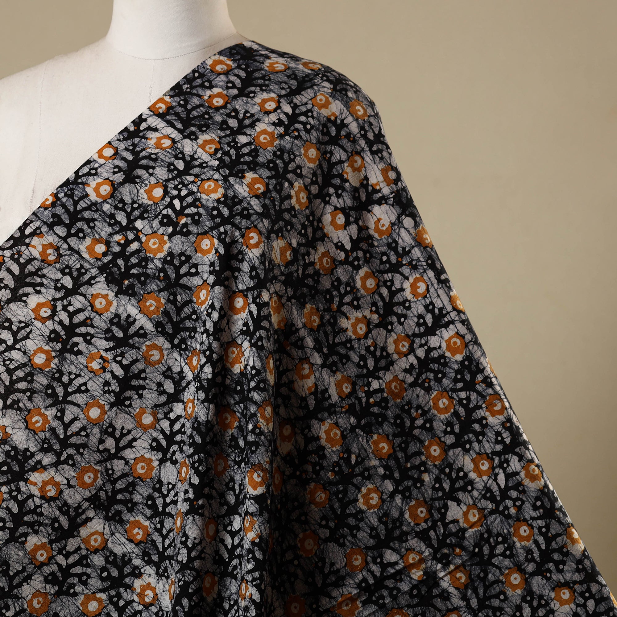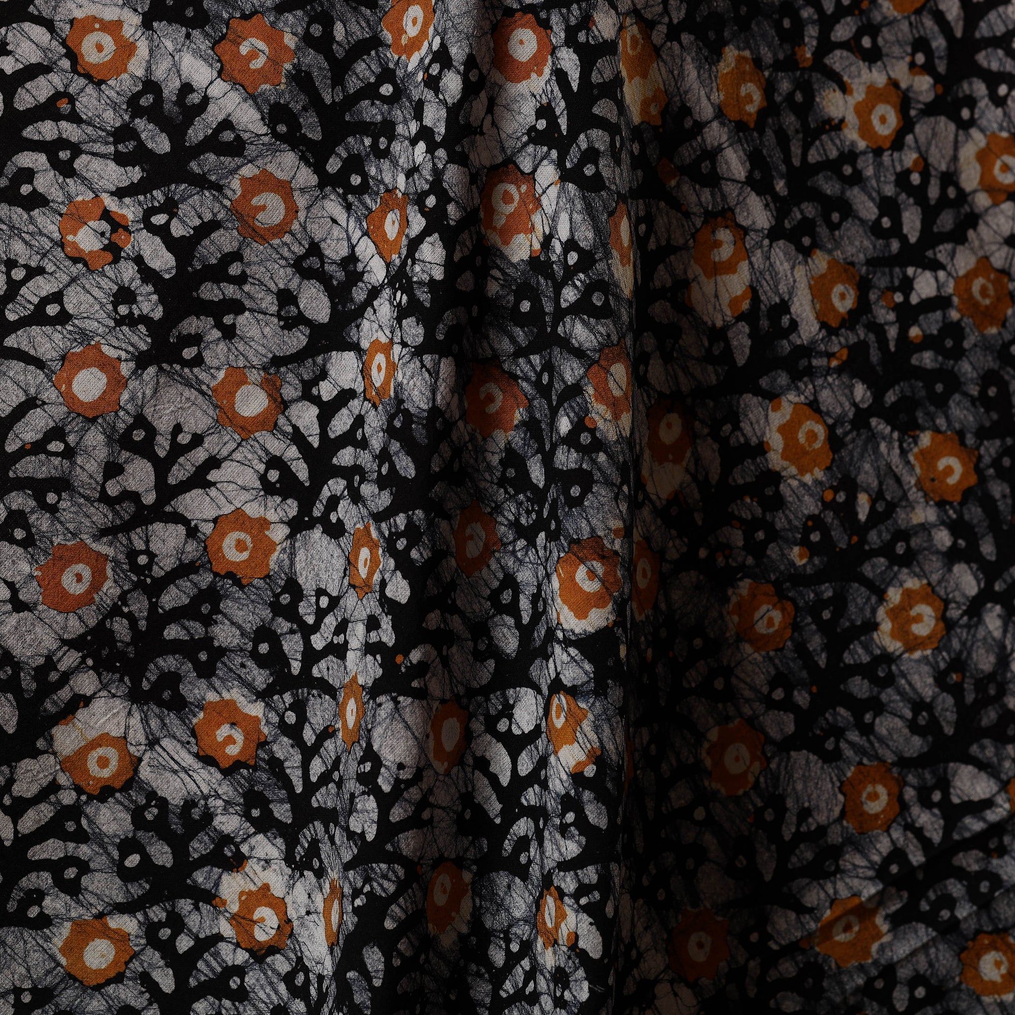 This black hand batik print fabric from Kutch, Gujarat, is made using the age-old wax-resist dyeing method, where hot wax is applied to the cloth before dyeing to create detailed patterns. Woven in breathable cotton, it offers a perfect blend of durability and comfort, making it suitable for ethnic wear, casual ensembles, or creative home décor projects.