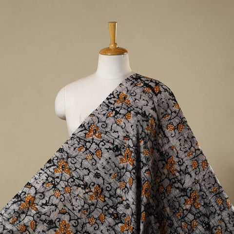 This black hand batik print fabric from Kutch, Gujarat, is made using the age-old wax-resist dyeing method, where hot wax is applied to the cloth before dyeing to create detailed patterns. Woven in breathable cotton, it offers a perfect blend of durability and comfort, making it suitable for ethnic wear, casual ensembles, or creative home décor projects.