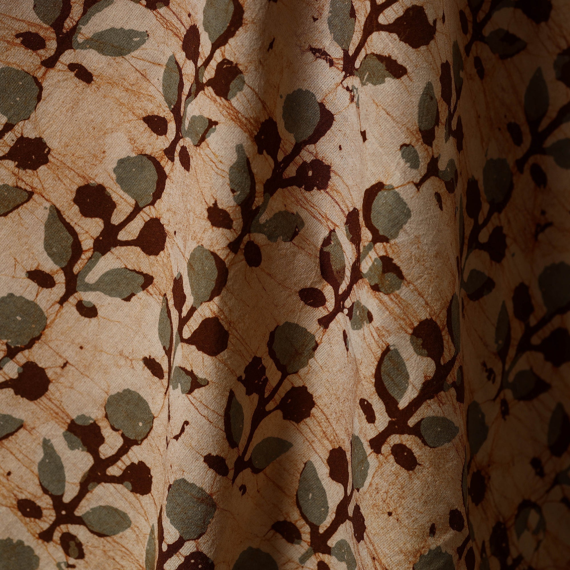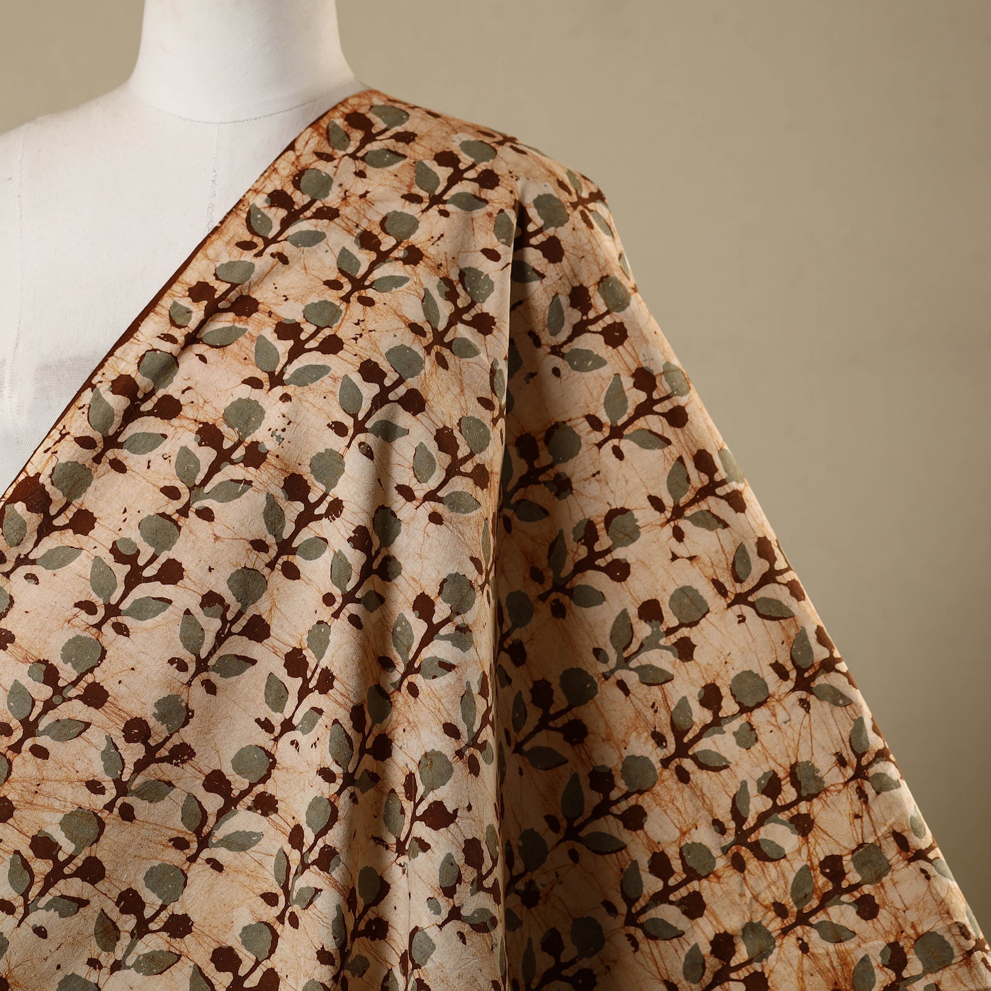 This beige hand batik print fabric from Kutch, Gujarat, is made using the age-old wax-resist dyeing method, where hot wax is applied to the cloth before dyeing to create detailed patterns. Woven in breathable cotton, it offers a perfect blend of durability and comfort, making it suitable for ethnic wear, casual ensembles, or creative home décor projects.