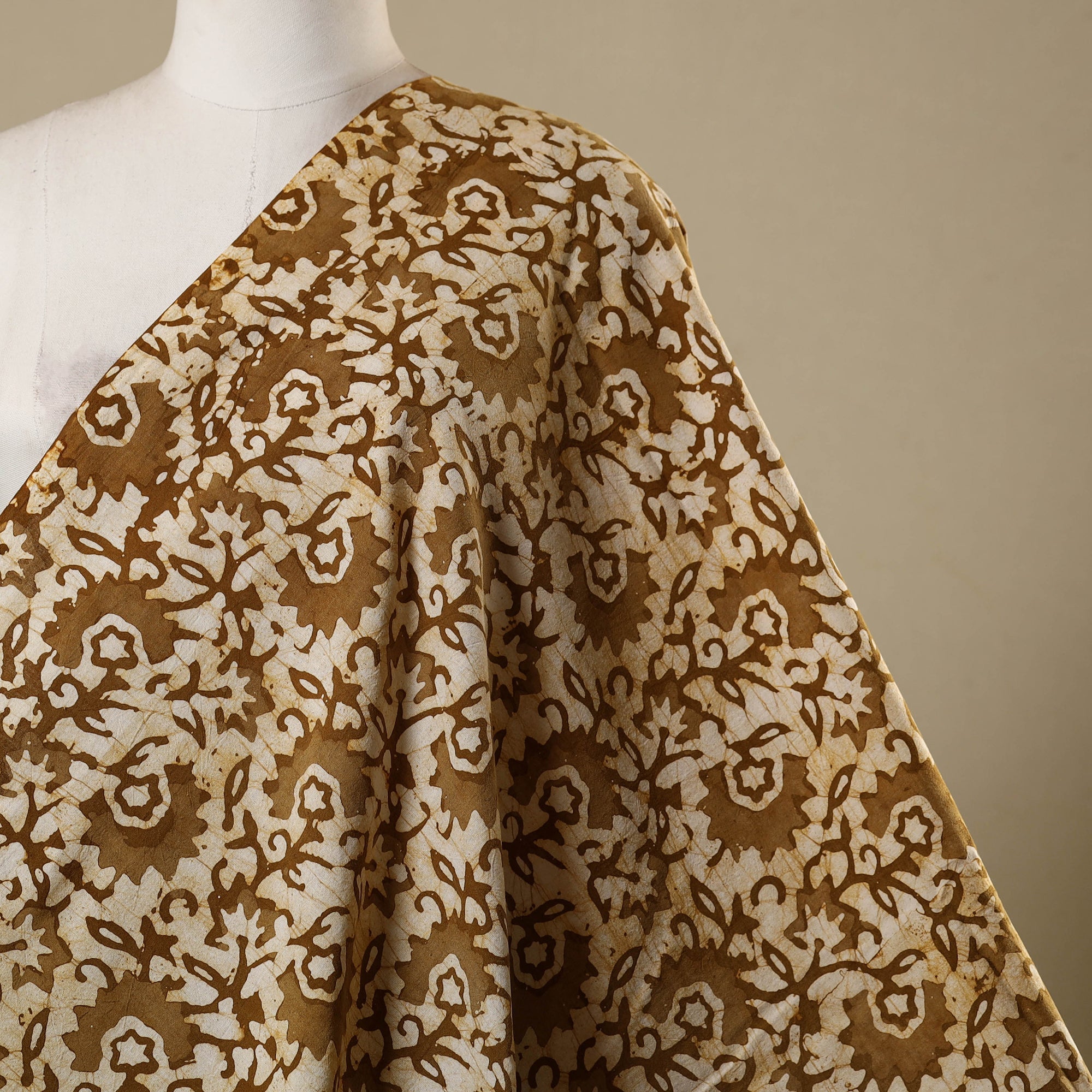 This beige hand batik print fabric from Kutch, Gujarat, is made using the age-old wax-resist dyeing method, where hot wax is applied to the cloth before dyeing to create detailed patterns. Woven in breathable cotton, it offers a perfect blend of durability and comfort, making it suitable for ethnic wear, casual ensembles, or creative home décor projects.