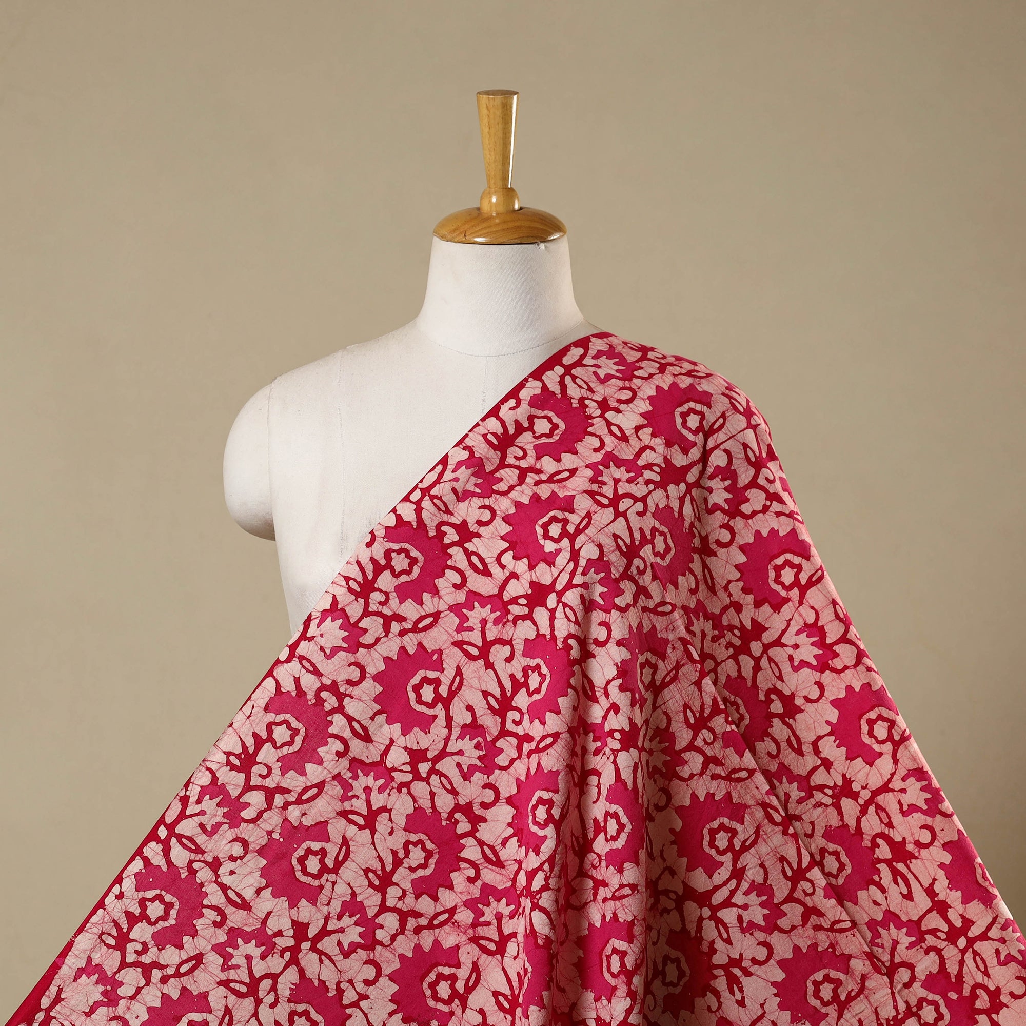 This pink hand batik print fabric from Kutch, Gujarat, is made using the age-old wax-resist dyeing method, where hot wax is applied to the cloth before dyeing to create detailed patterns. Woven in breathable cotton, it offers a perfect blend of durability and comfort, making it suitable for ethnic wear, casual ensembles, or creative home décor projects.