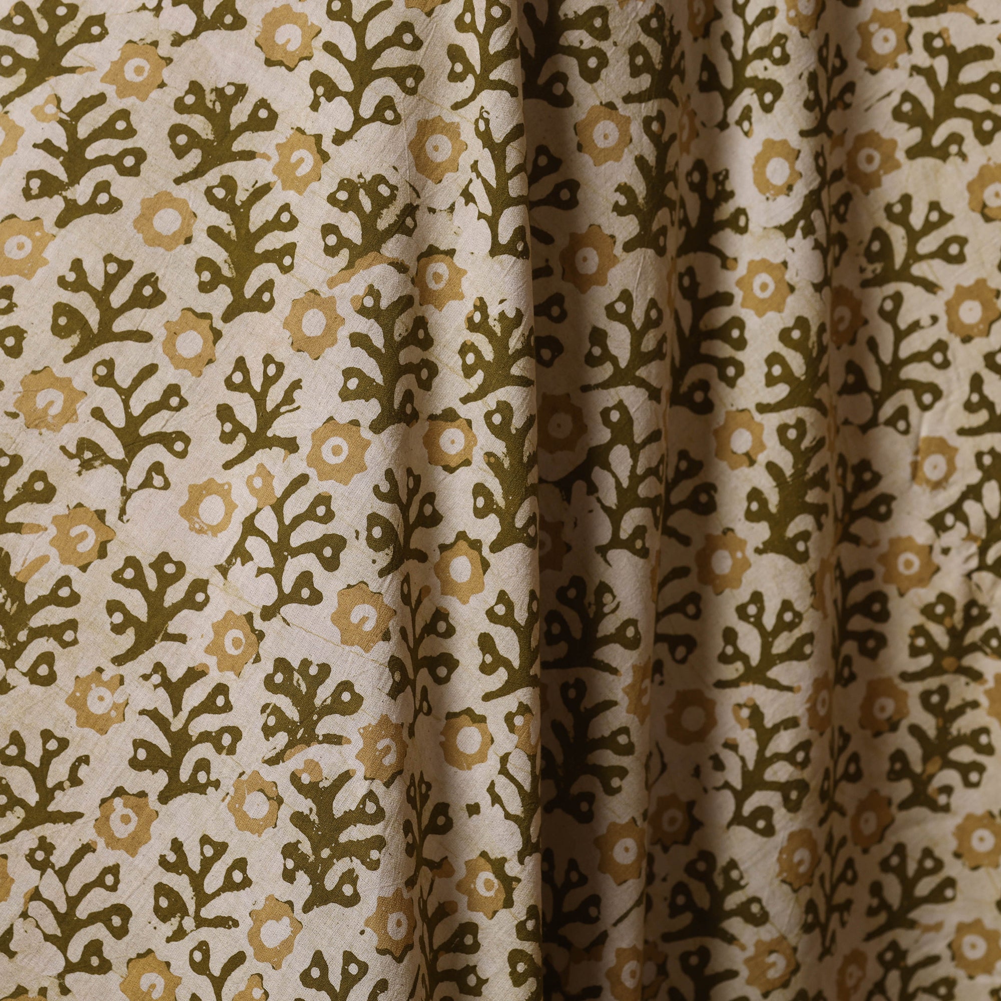 This beige Kutch batik fabric is created using the centuries-old wax resist dyeing method, where molten wax is applied before dyeing to form intricate motifs. Crafted in breathable cotton, it blends durability with comfort, making it perfect for ethnic wear, casual outfits, or decor projects.
