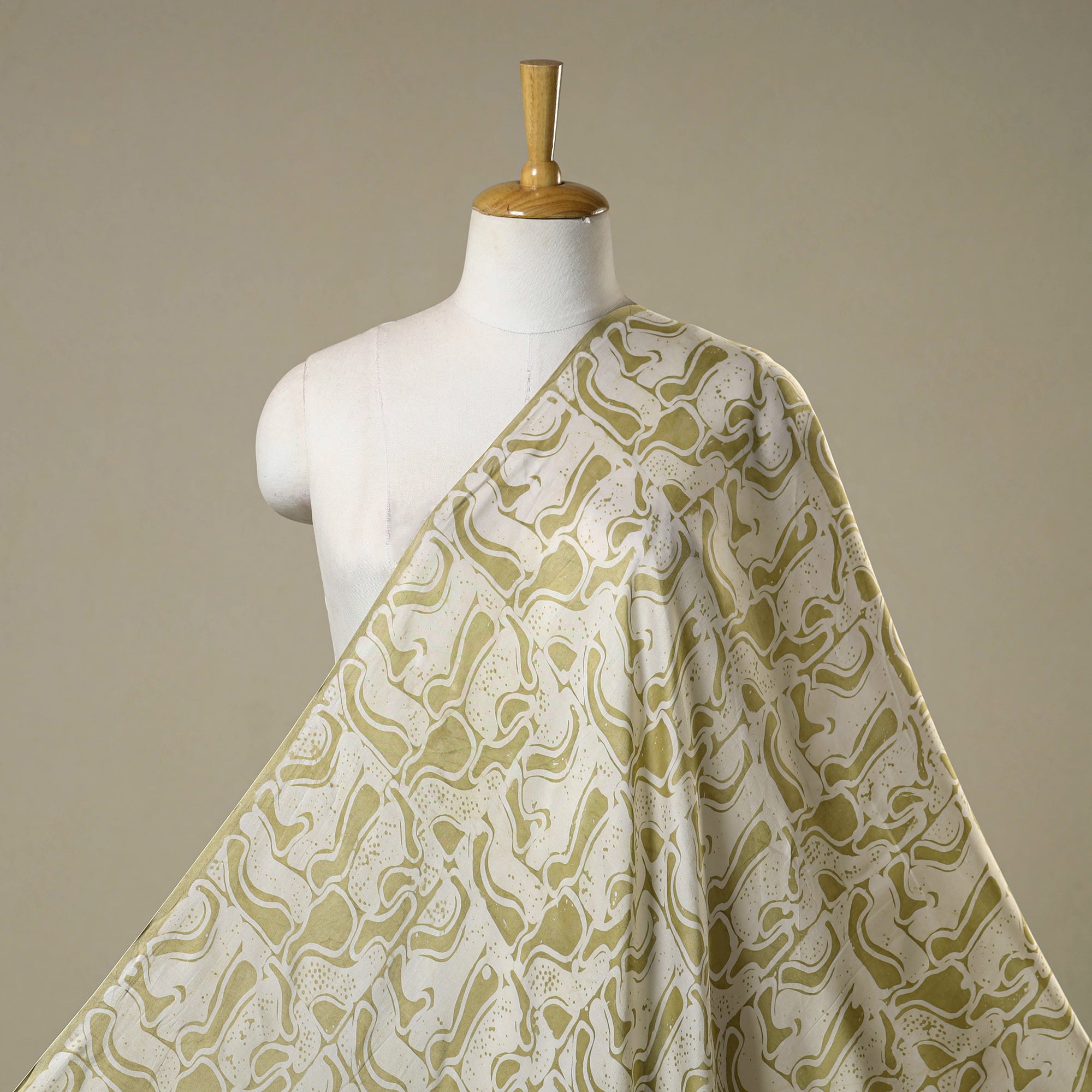 This green hand batik print fabric from Kutch is created using the centuries-old wax-resist dyeing technique, where molten wax is applied before dyeing to form intricate motifs. This fabric is made from modal silk, which is a viscose by cotton blend, offering a beautiful drape, subtle sheen, and enhanced comfort. Perfect for creating ethnic wear, casual outfits, or elegant home décor projects, it beautifully combines traditional artistry with a contemporary touch.