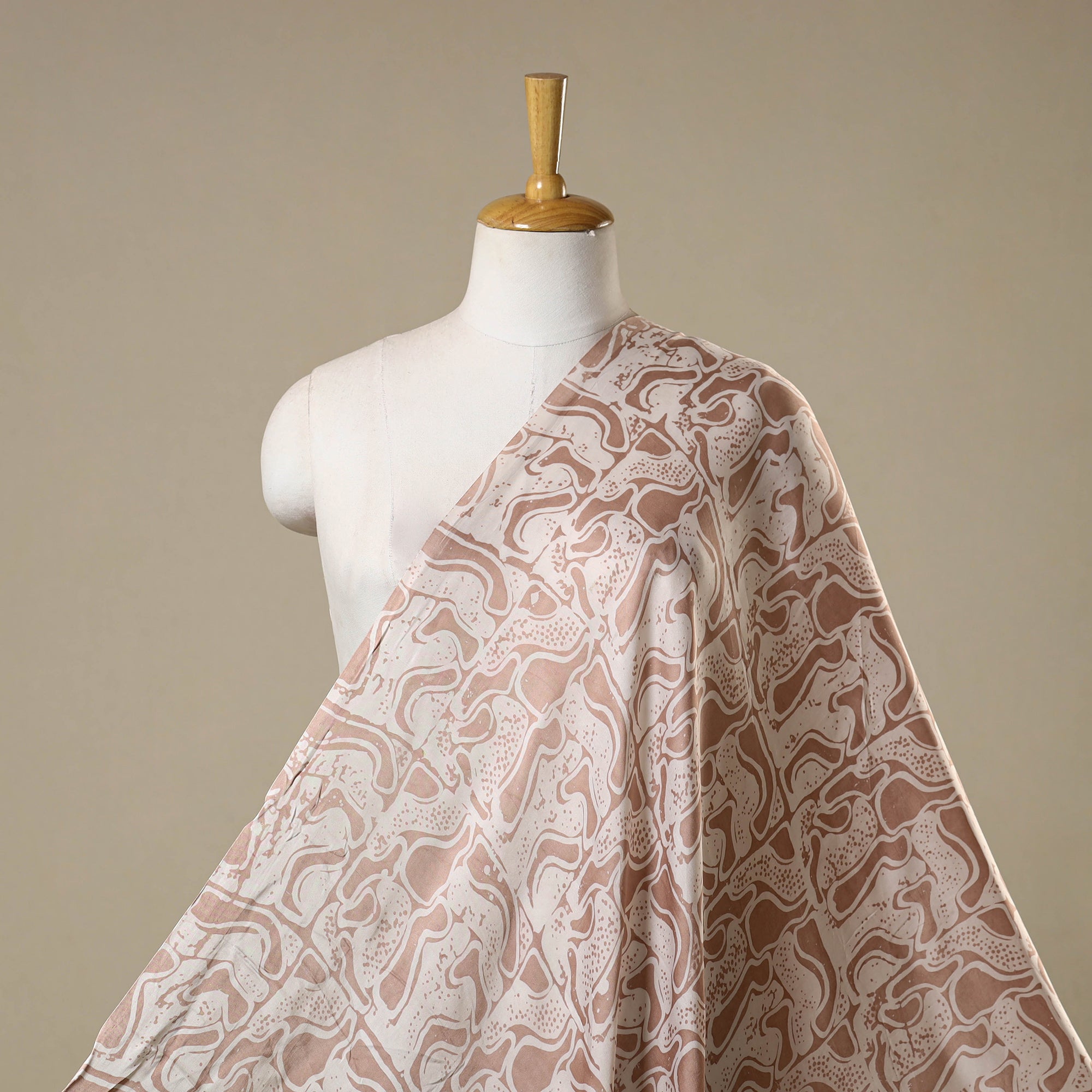 This brown hand batik print fabric from Kutch is created using the centuries-old wax-resist dyeing technique, where molten wax is applied before dyeing to form intricate motifs. This fabric is made from modal silk, which is a viscose by cotton blend, offering a beautiful drape, subtle sheen, and enhanced comfort. Perfect for creating ethnic wear, casual outfits, or elegant home décor projects, it beautifully combines traditional artistry with a contemporary touch.