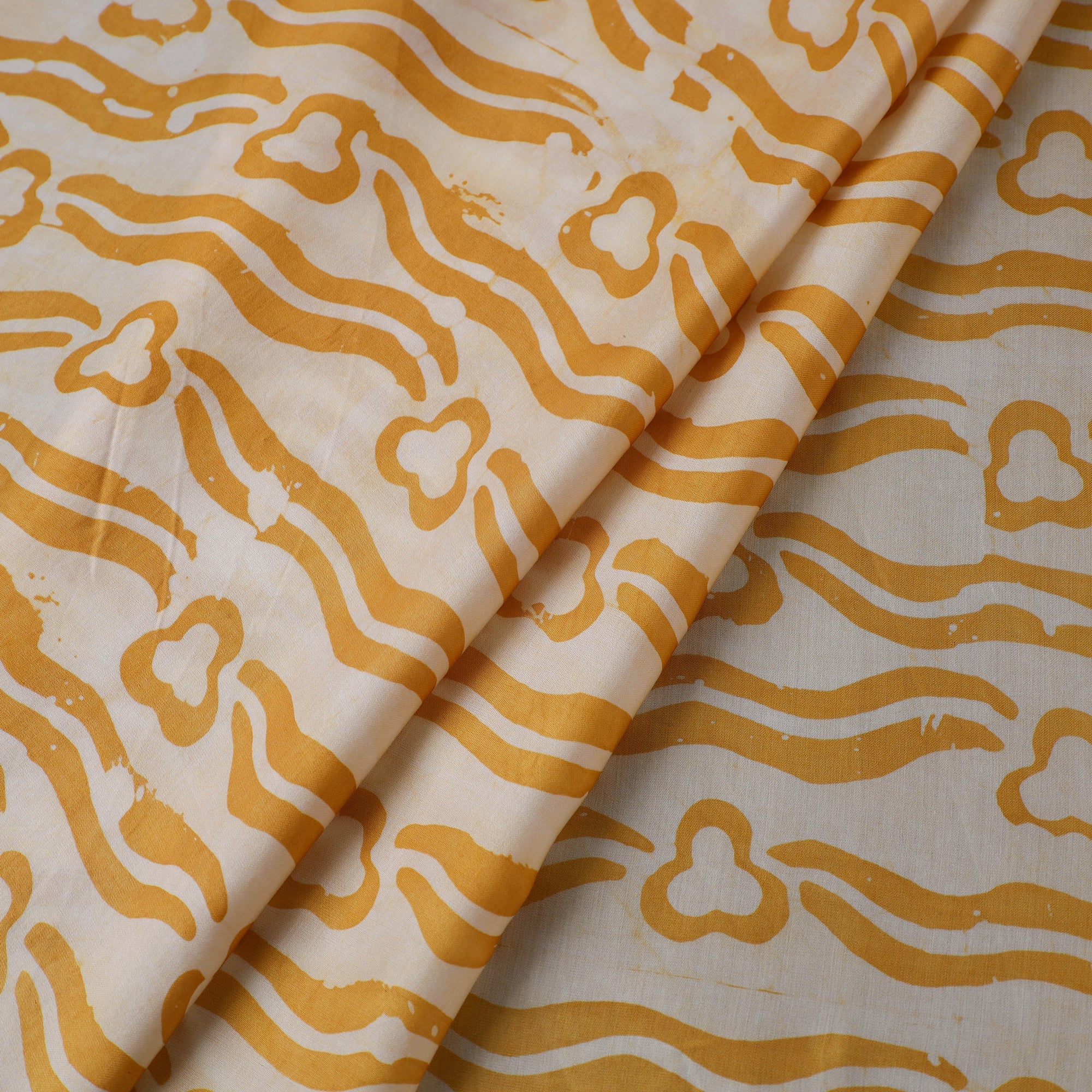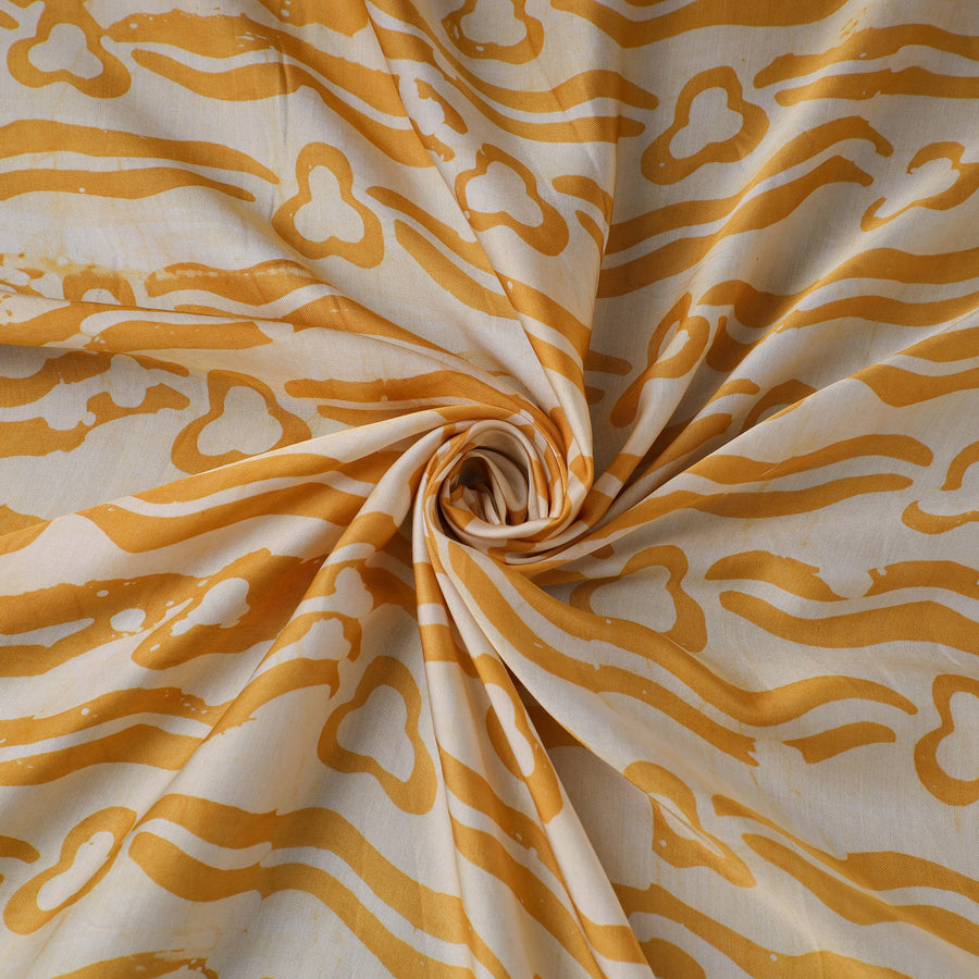 This yellow hand batik print fabric from Kutch is created using the centuries-old wax-resist dyeing technique, where molten wax is applied before dyeing to form intricate motifs. This fabric is made from modal silk, which is a viscose by cotton blend, offering a beautiful drape, subtle sheen, and enhanced comfort. Perfect for creating ethnic wear, casual outfits, or elegant home décor projects, it beautifully combines traditional artistry with a contemporary touch.