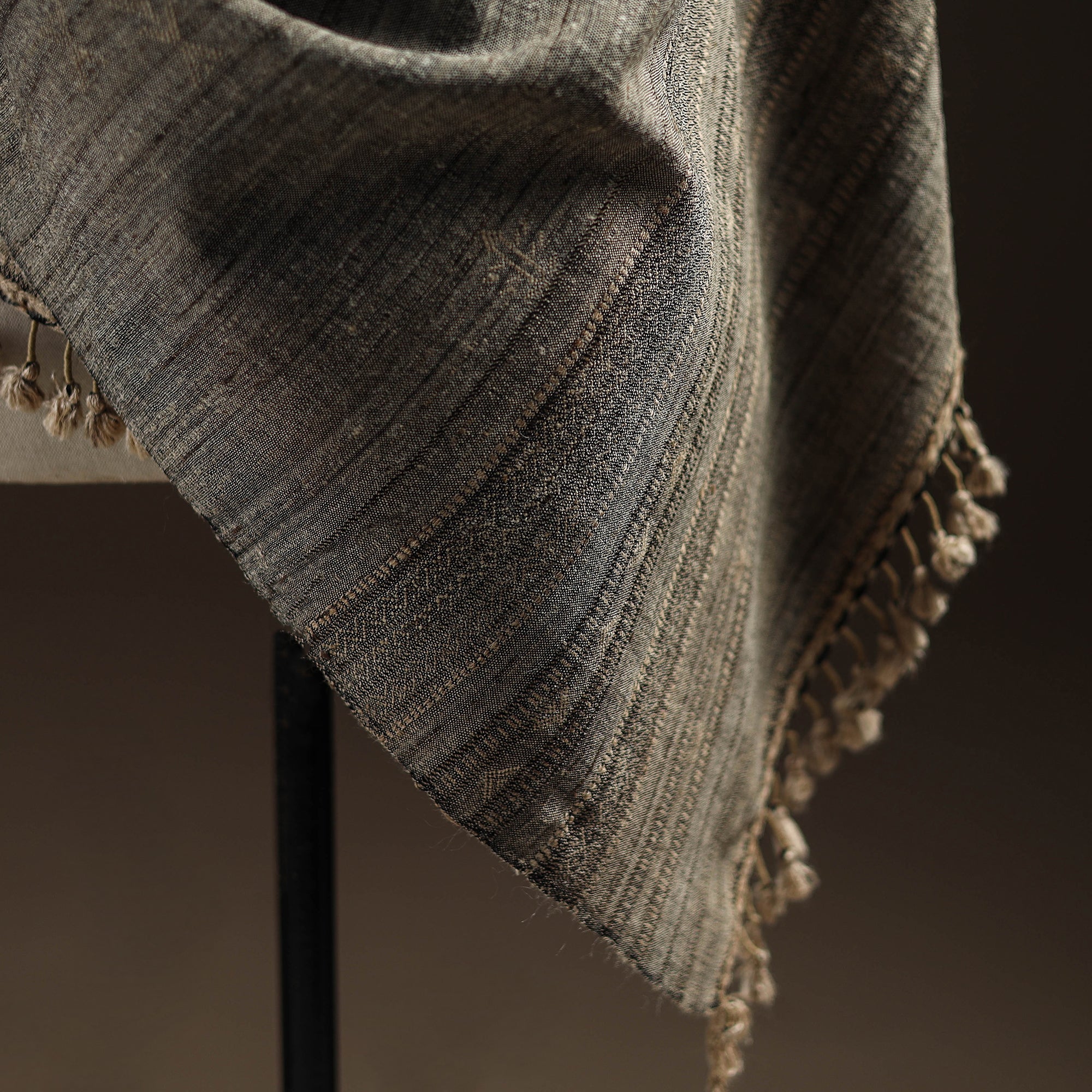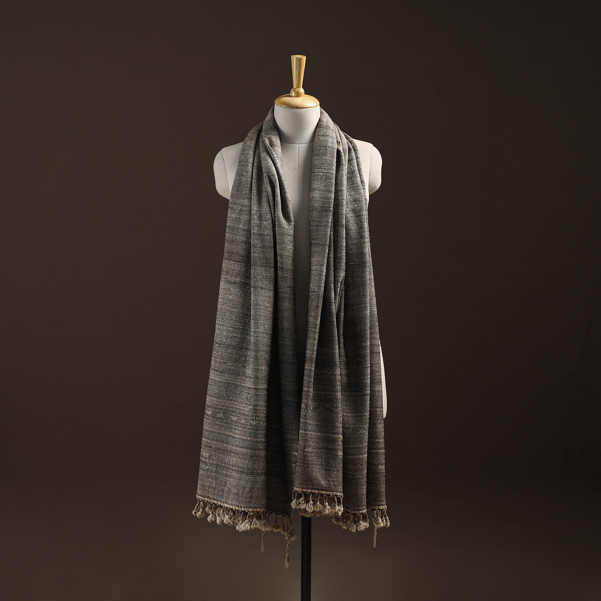 Kutch bhujodi handspun handwoven chomuk buta shawl crafted by skilled artisan Vankar Bhimji Kanji from Bhuj Gujarat. Adorned with intricate Kutchi motifs and tassle. Made from merino wool x katia silk it offers both warmth and comfort. A perfect blend of tradition and style ideal for winter wear.