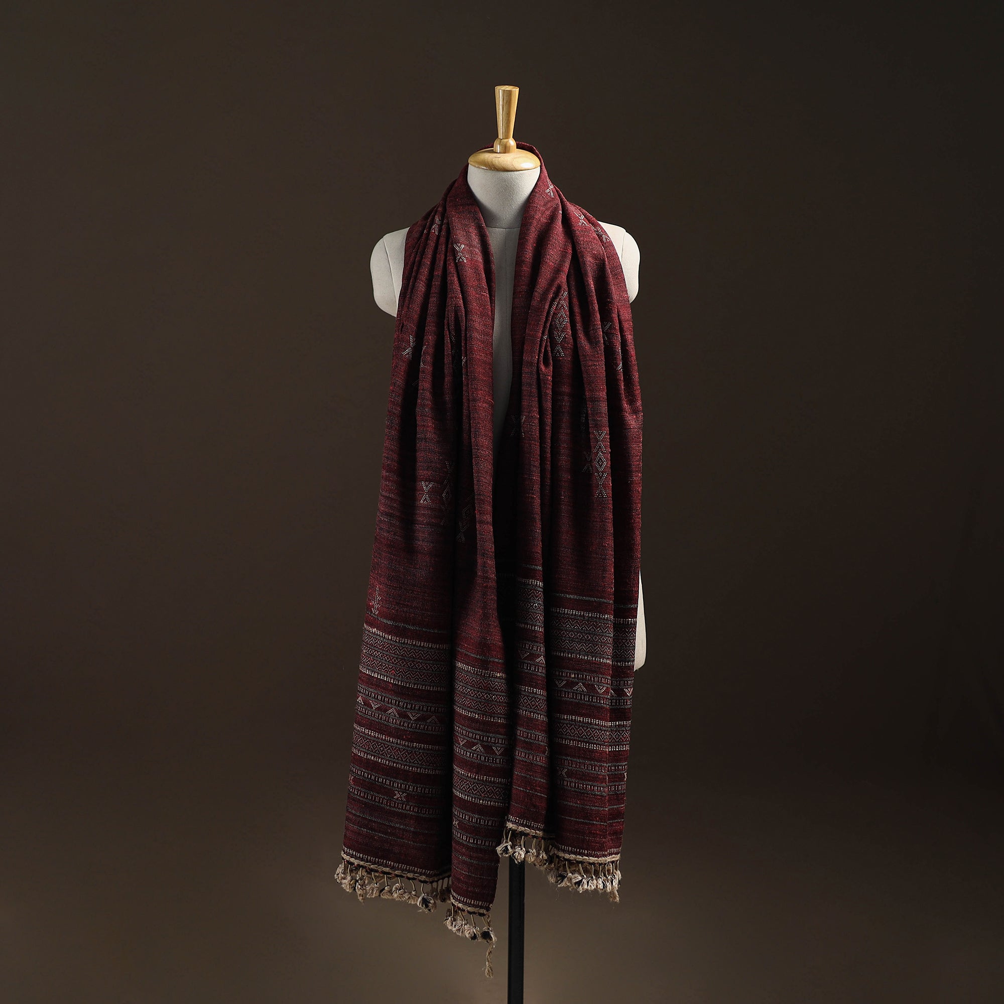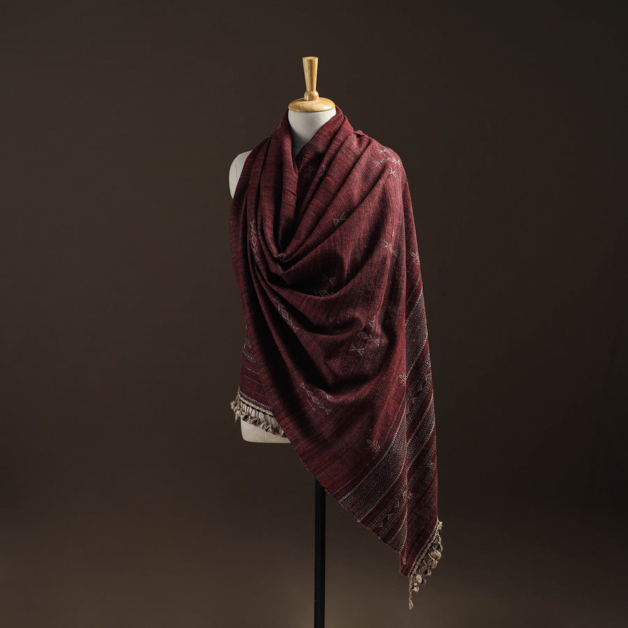 Kutch bhujodi handspun handwoven chomuk buta shawl crafted by skilled artisan Vankar Bhimji Kanji from Bhuj Gujarat. Adorned with intricate Kutchi motifs and tassle. Made from merino wool x katia silk it offers both warmth and comfort. A perfect blend of tradition and style ideal for winter wear.