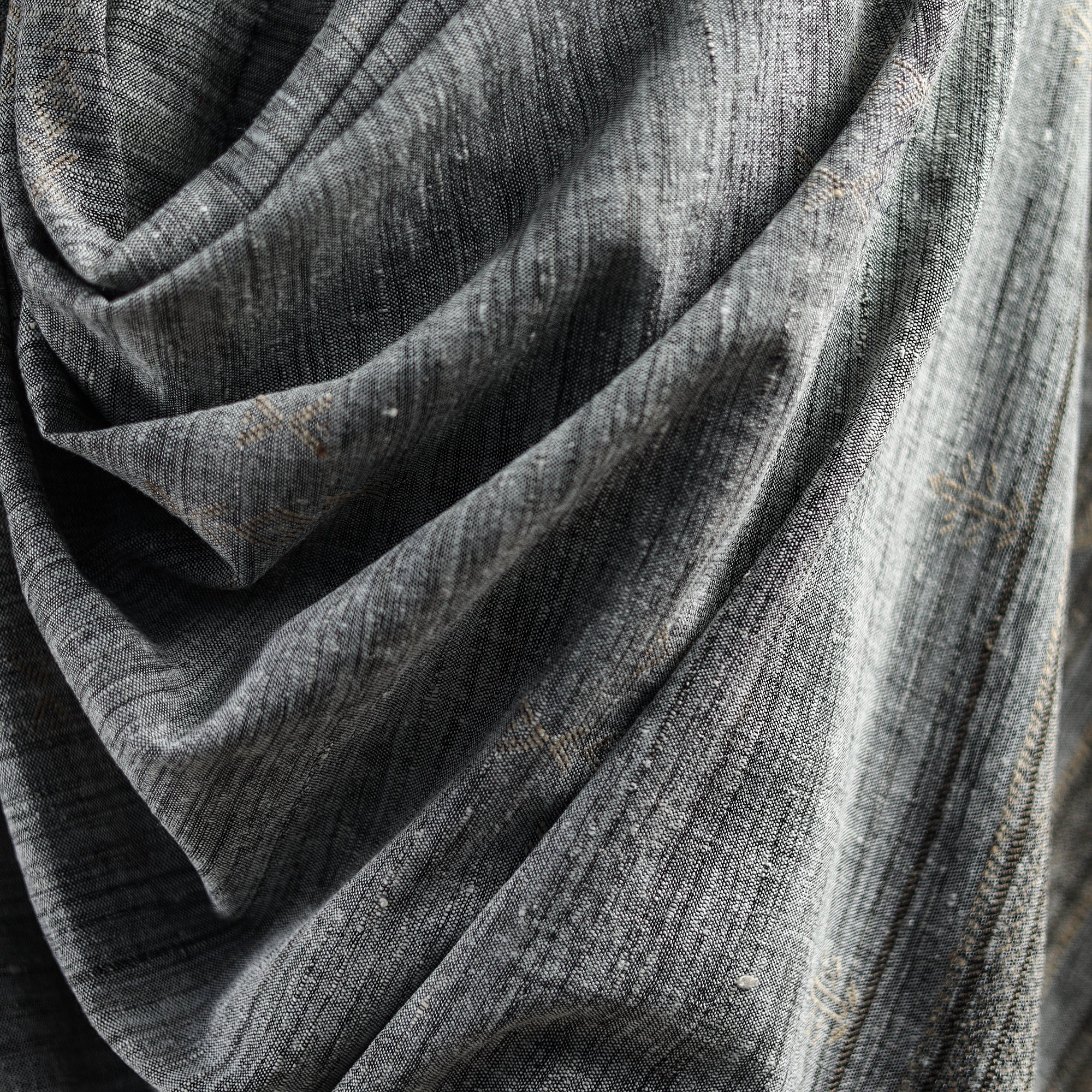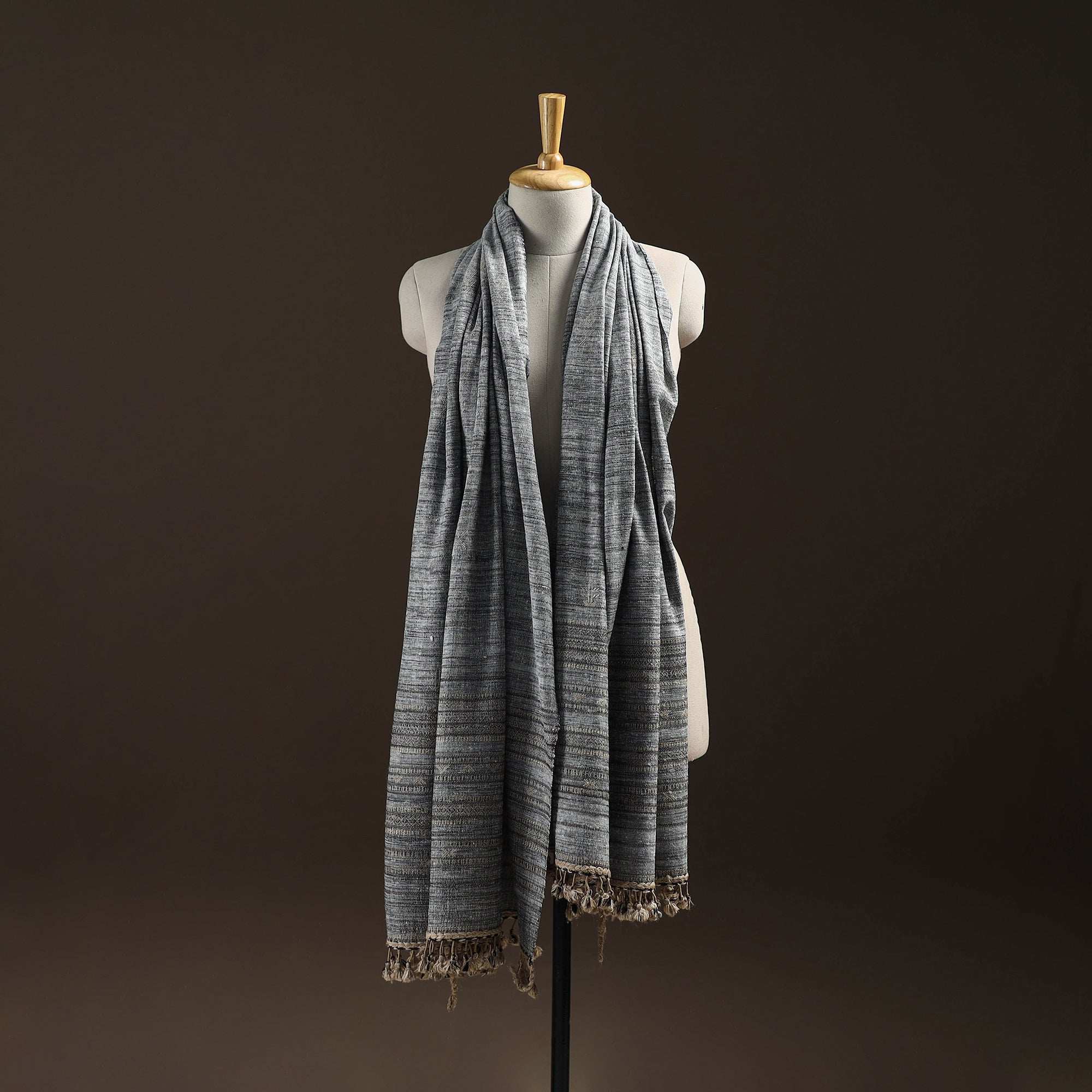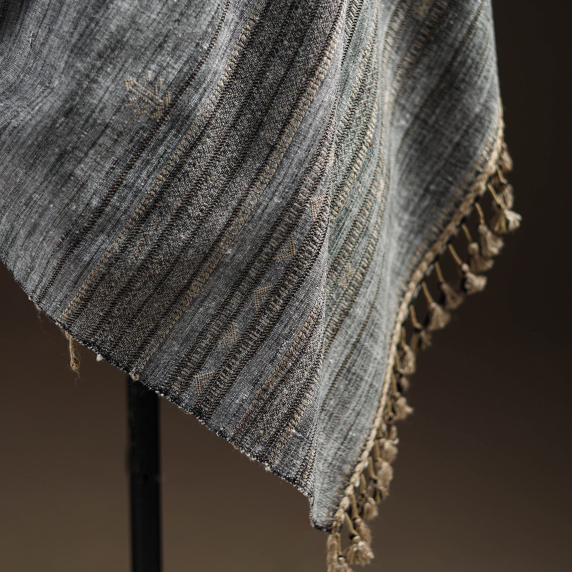 Kutch bhujodi handspun handwoven chomuk buta shawl crafted by skilled artisan Vankar Bhimji Kanji from Bhuj Gujarat. Adorned with intricate Kutchi motifs and tassle. Made from merino wool x katia silk it offers both warmth and comfort. A perfect blend of tradition and style ideal for winter wear.