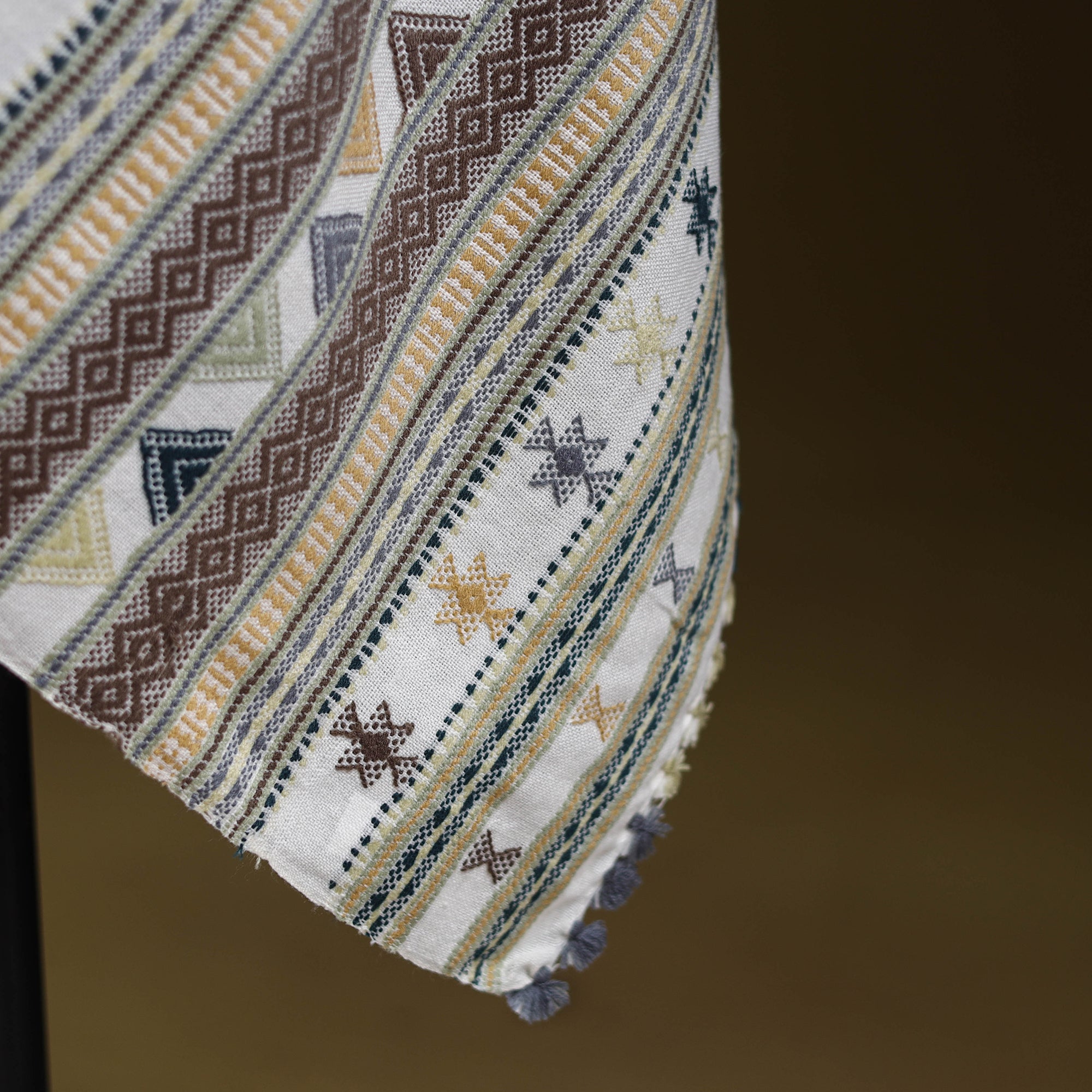 White kutch bhujodi handwoven shawl created by skilled artisan Vankar Bhimji Kanji from Bhuj Gujarat. Adorned with traditional intricate Kutchi motifs. Made from acrylic wool it offers both warmth and comfort. A perfect blend of tradition and style ideal for everyday elegance or festive wear.