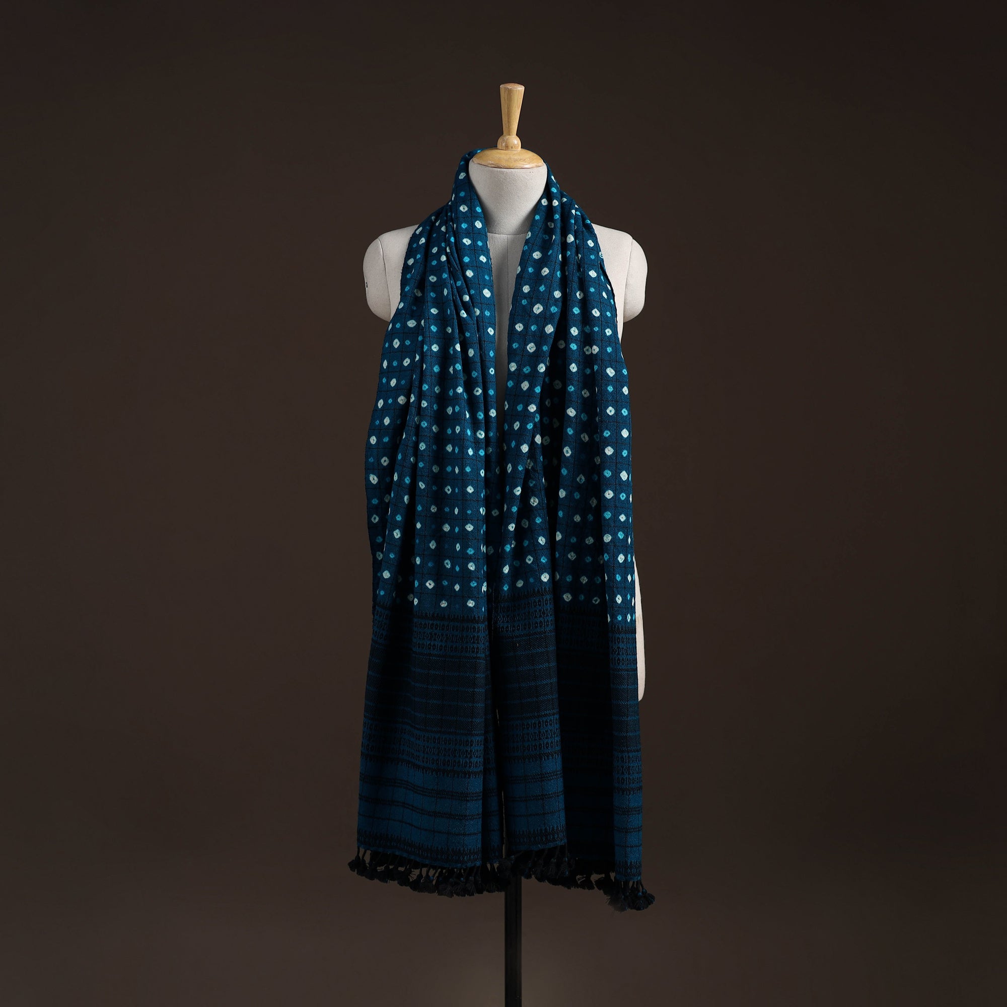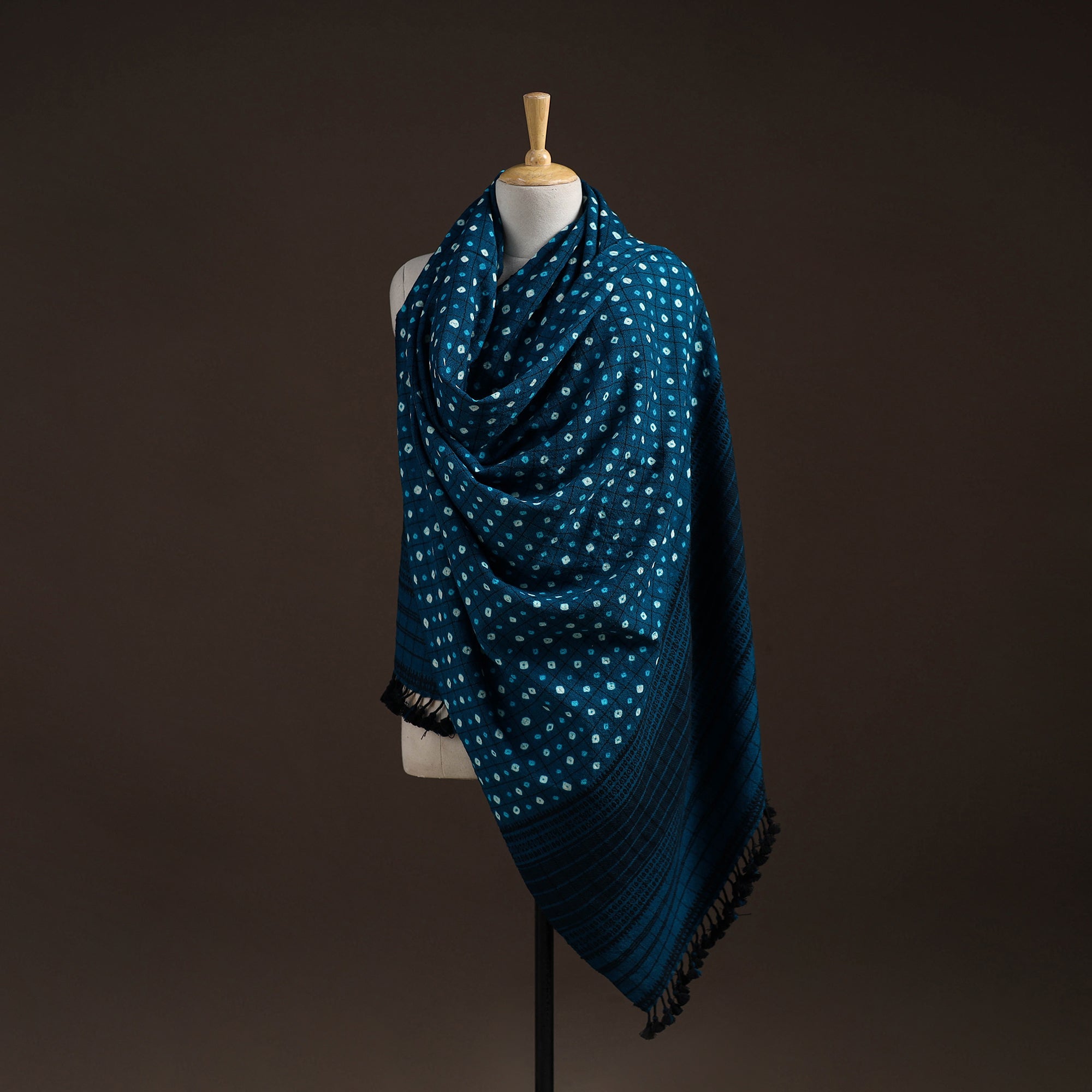 Bhujodi bandhani shawl handwoven by Vinay Siju in Bhuj, Gujarat. Created using tie-dye technique, where the fabric is carefully tied in small sections before dyeing. Designed with traditional Kutchi motifs and tassels. Made from merino wool to provide reliable warmth. A practical choice for everyday winter wear or outings.