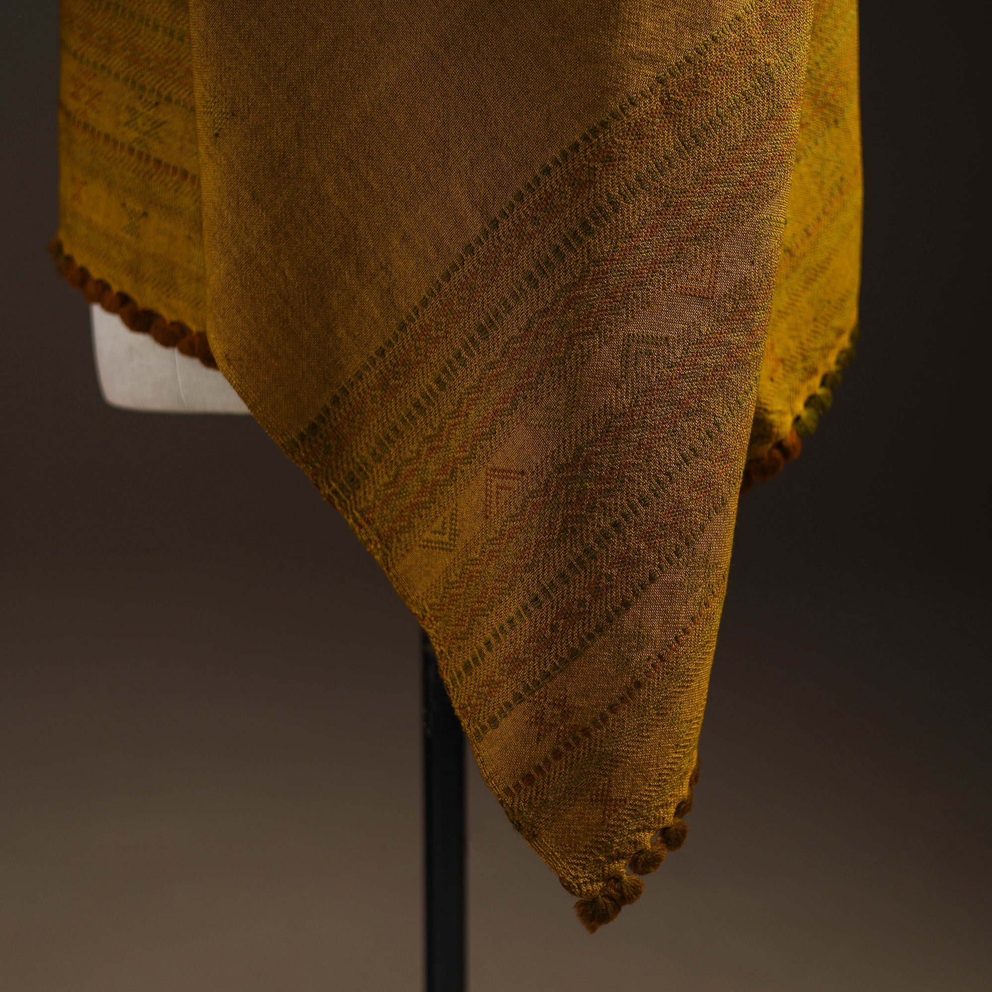 Kutch bhujodi handwoven dhabla shawl crafted by skilled artisan Vankar Bhimji Kanji from Bhuj Gujarat. Adorned with intricate Kutchi motifs and tassle. Made from merino wool wool it offers both warmth and comfort. A perfect blend of tradition and style ideal for daily winter wear.