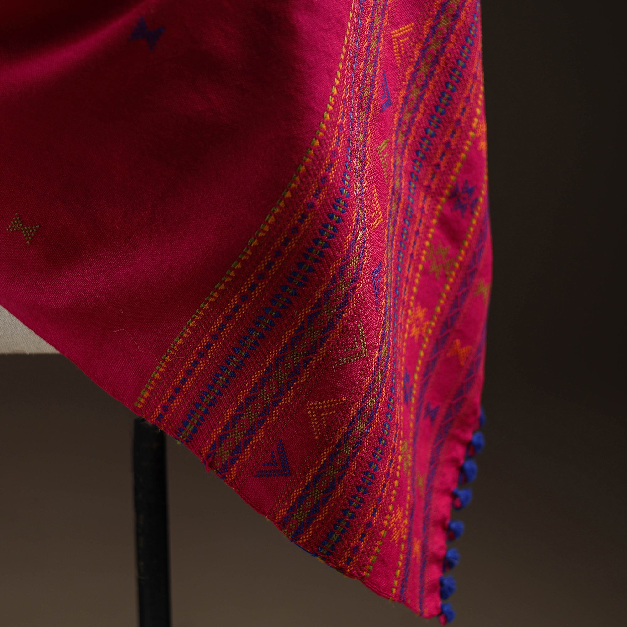 Kutch bhujodi handwoven dhabla shawl crafted by skilled artisan Vankar Bhimji Kanji from Bhuj Gujarat. Adorned with intricate Kutchi motifs and tassle. Made from merino wool wool it offers both warmth and comfort. A perfect blend of tradition and style ideal for daily winter wear.