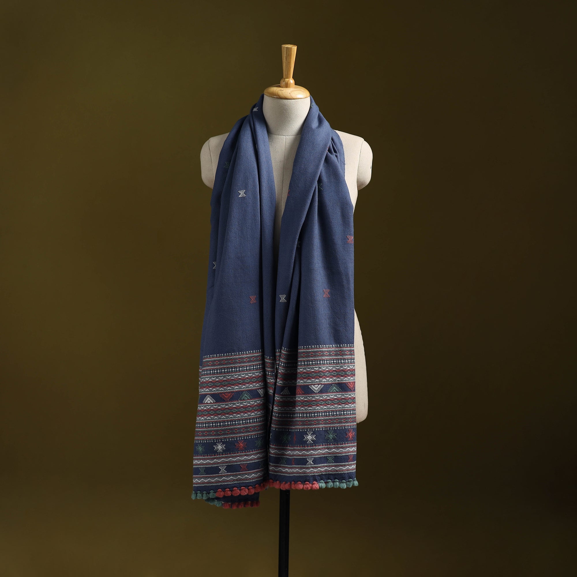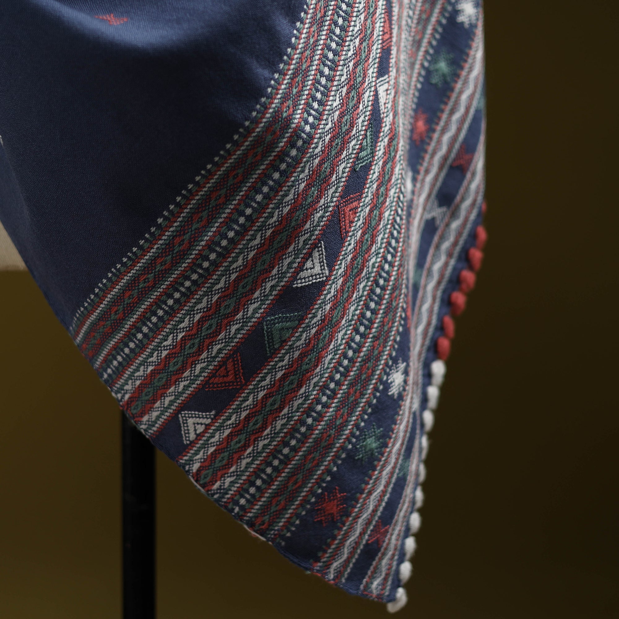 Blue kutch handwoven dhabla shawl crafted by skilled artisan Vankar Bhimji Kanji from Bhuj Gujarat. Adorned with intricate Kutchi motifs and tassle. Made from merino wool wool it offers both warmth and comfort. A perfect blend of tradition and style ideal for daily winter wear.