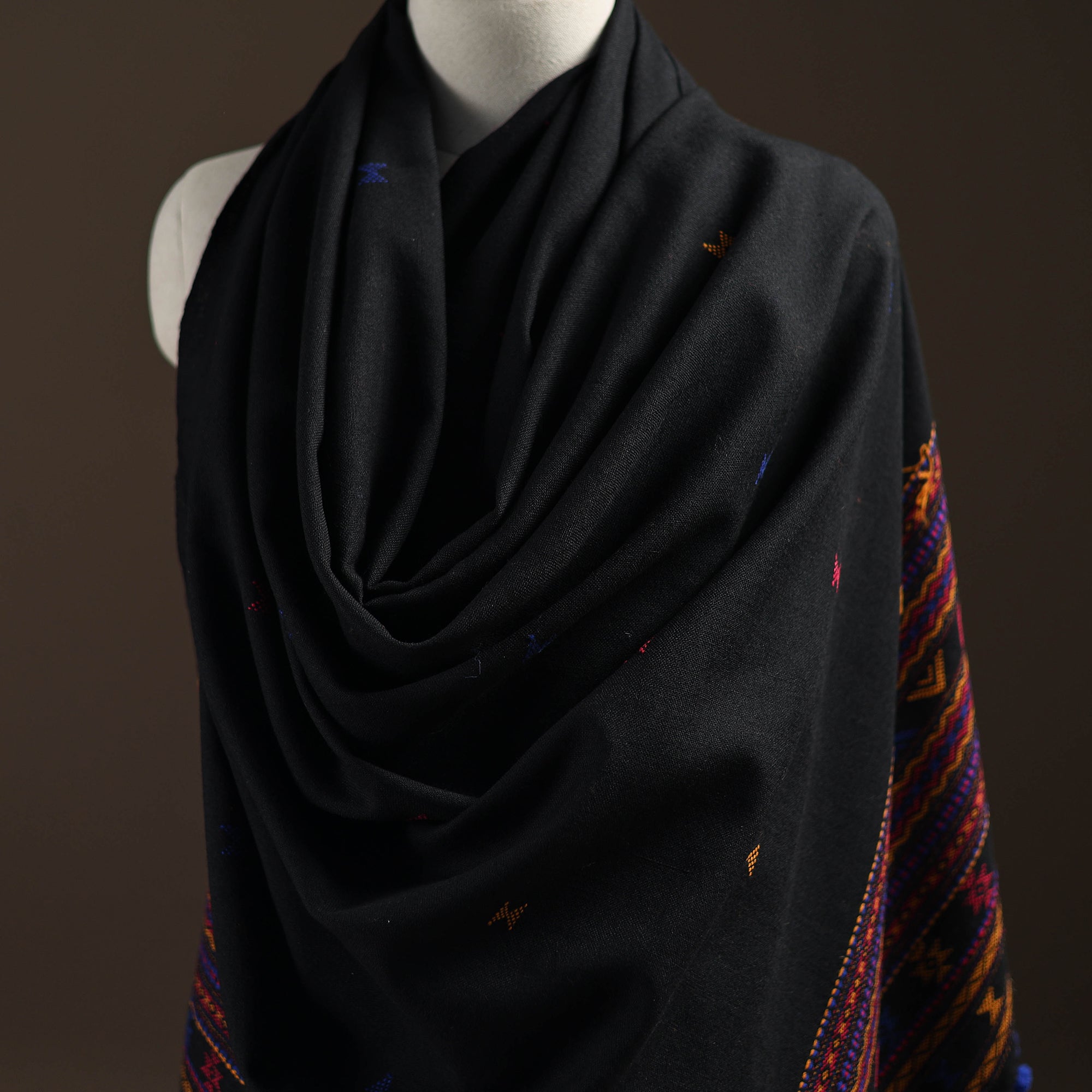 Kutch bhujodi handwoven dhabla shawl crafted by skilled artisan Vankar Bhimji Kanji from Bhuj Gujarat. Adorned with intricate Kutchi motifs and tassle. Made from merino wool wool it offers both warmth and comfort. A perfect blend of tradition and style ideal for daily winter wear.