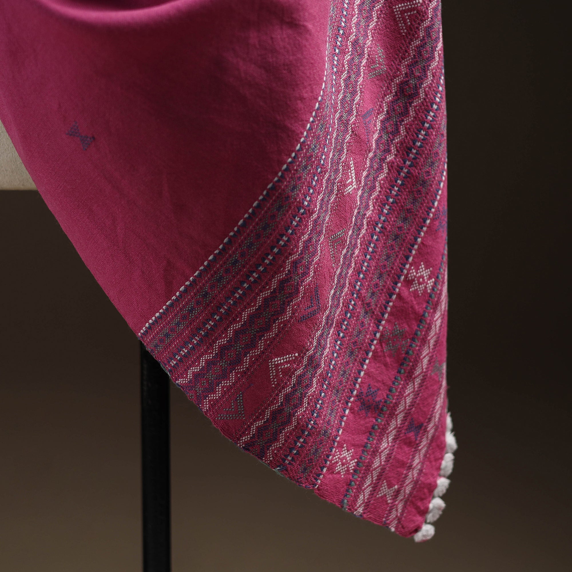 Pink kutch handwoven dhabla shawl crafted by skilled artisan Vankar Bhimji Kanji from Bhuj Gujarat. Adorned with intricate Kutchi motifs and tassle. Made from merino wool wool it offers both warmth and comfort. A perfect blend of tradition and style ideal for daily winter wear.