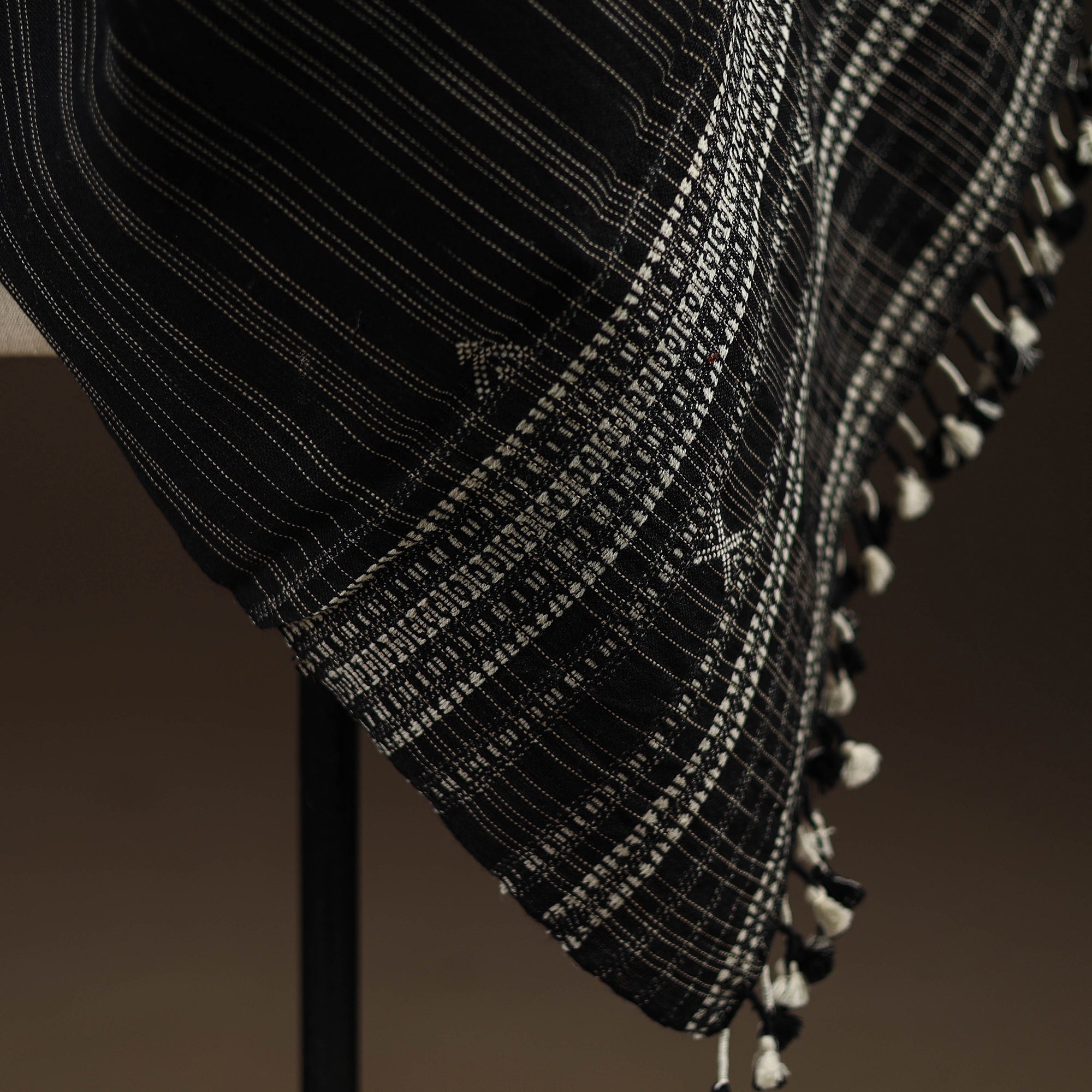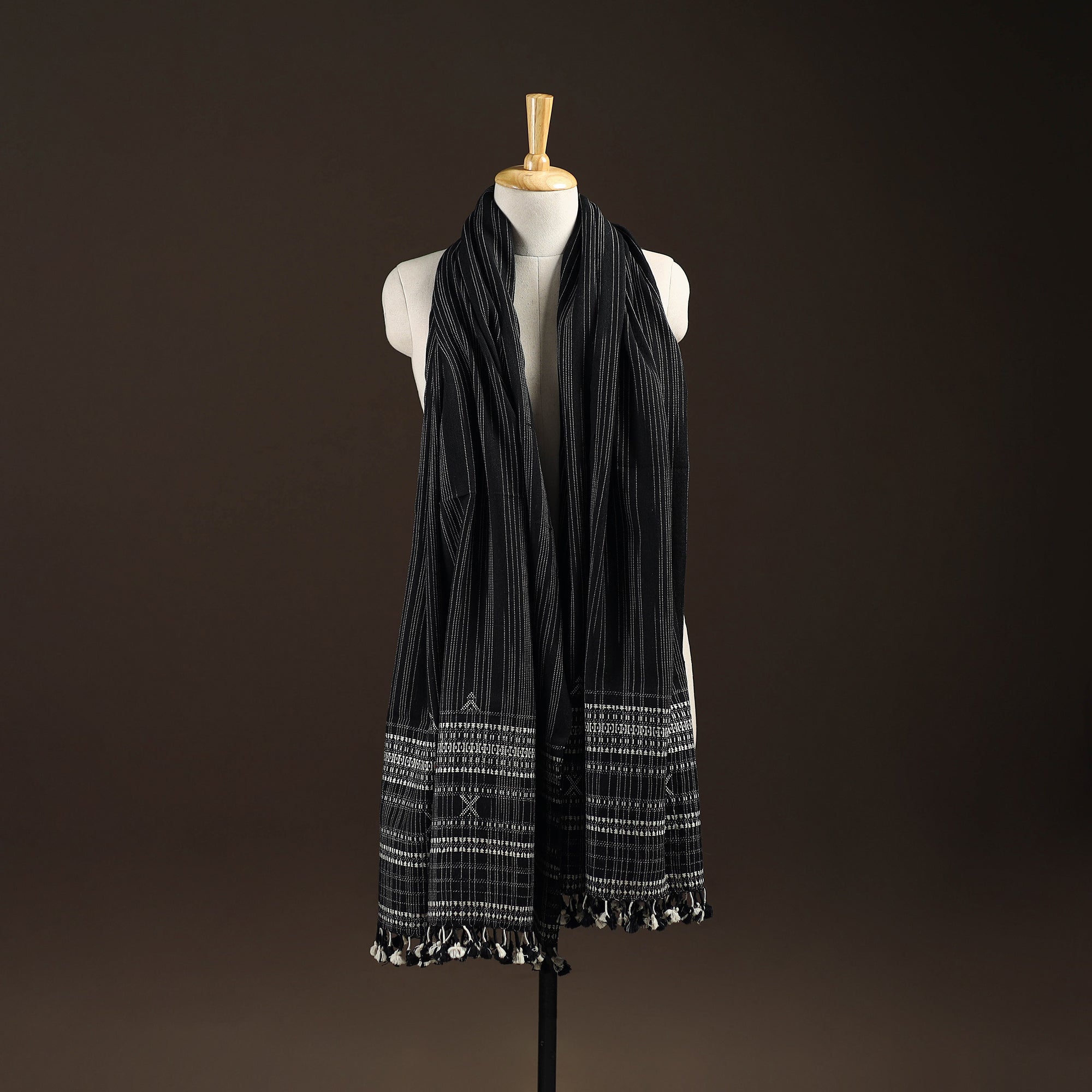 | Material | Black bhujodi shawl handwoven by Vinay Siju in Bhuj, Gujarat. Designed with traditional Kutchi motifs and tassels. Made from merino wool to provide reliable warmth. A practical choice for everyday winter wear or outings. |