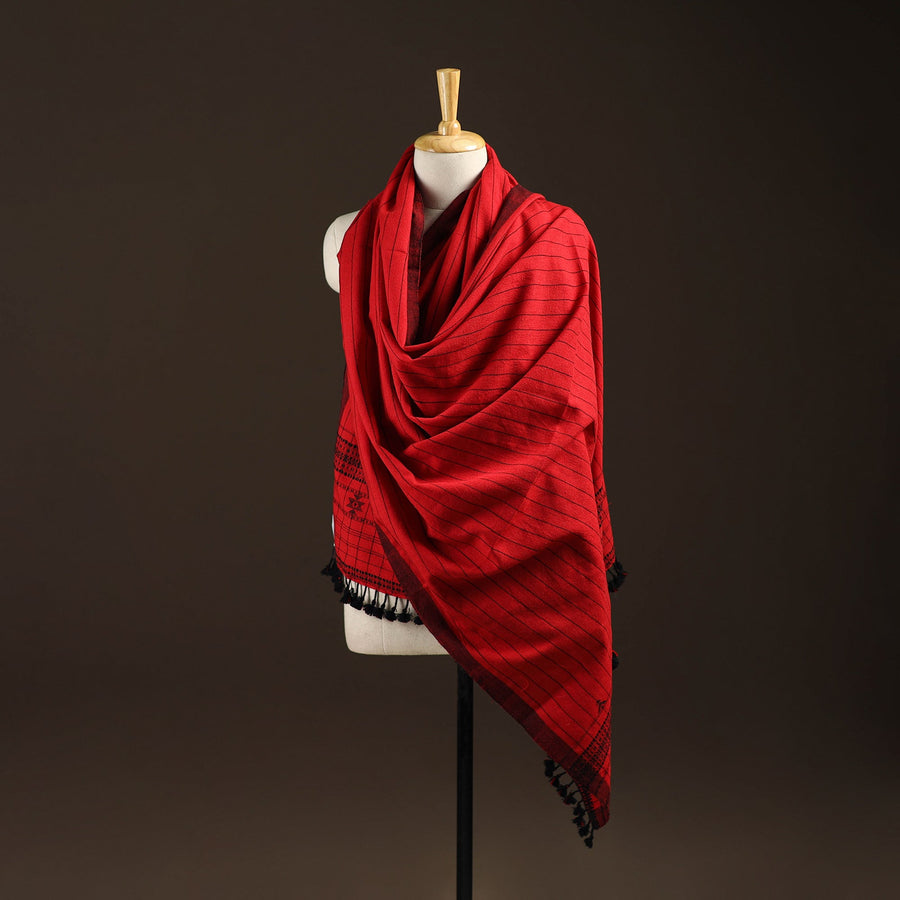 Red bhujodi shawl handwoven by Vinay Siju in Bhuj, Gujarat. Designed with traditional Kutchi motifs and tassels. Made from merino wool to provide reliable warmth. A practical choice for everyday winter wear or outings.