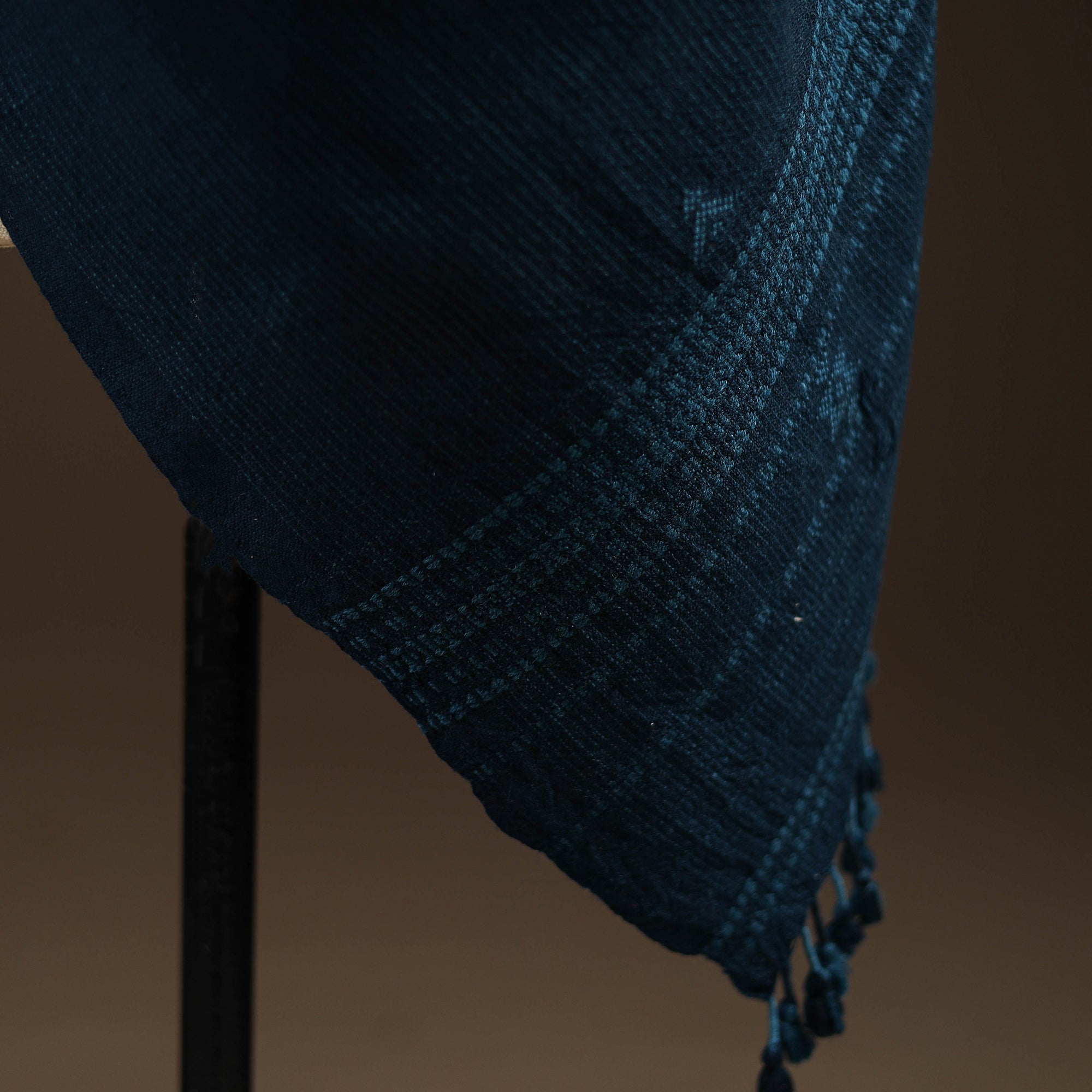 Blue bhujodi shawl handwoven by Vinay Siju in Bhuj, Gujarat. Designed with traditional Kutchi motifs and tassels. Made from merino wool to provide reliable warmth. A practical choice for everyday winter wear or outings.