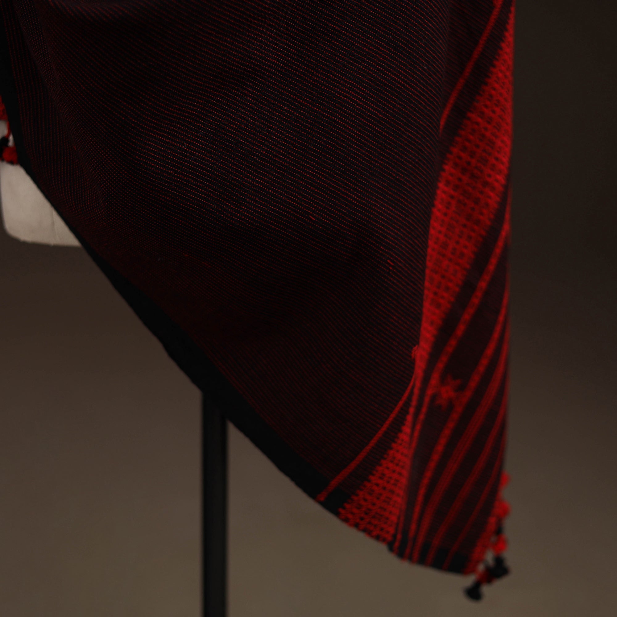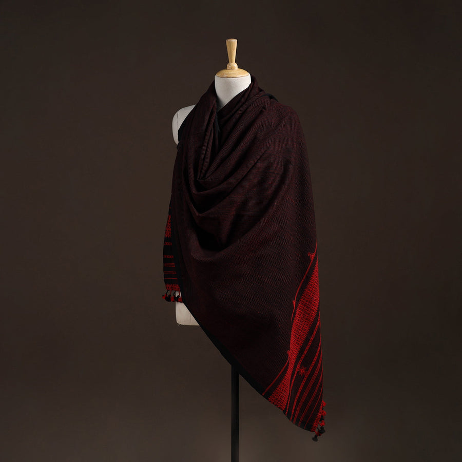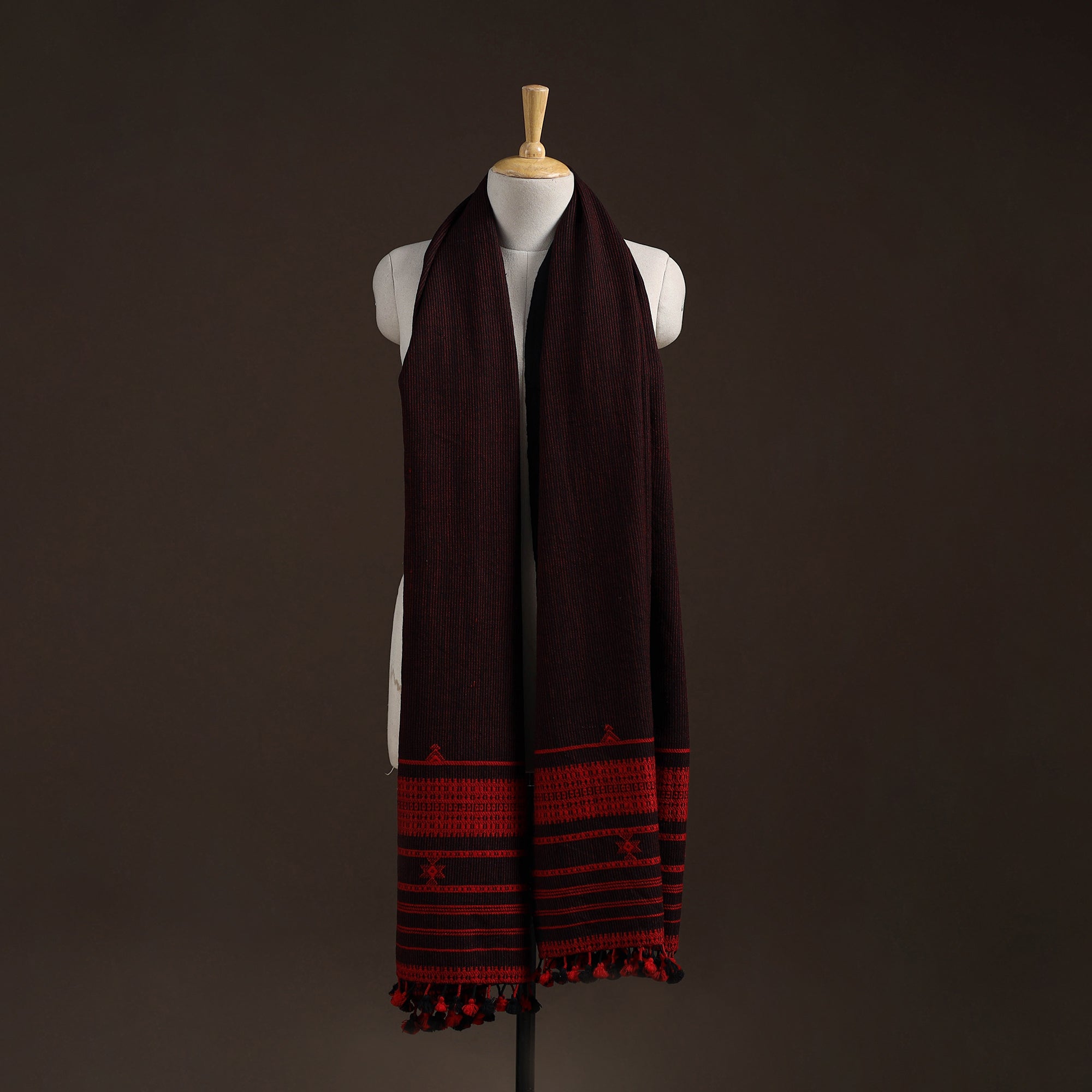 Bhujodi shawl handwoven by Vinay Siju in Bhuj, Gujarat. Designed with traditional Kutchi motifs and tassels. Made from merino wool to provide reliable warmth. A practical choice for everyday winter wear or outings.