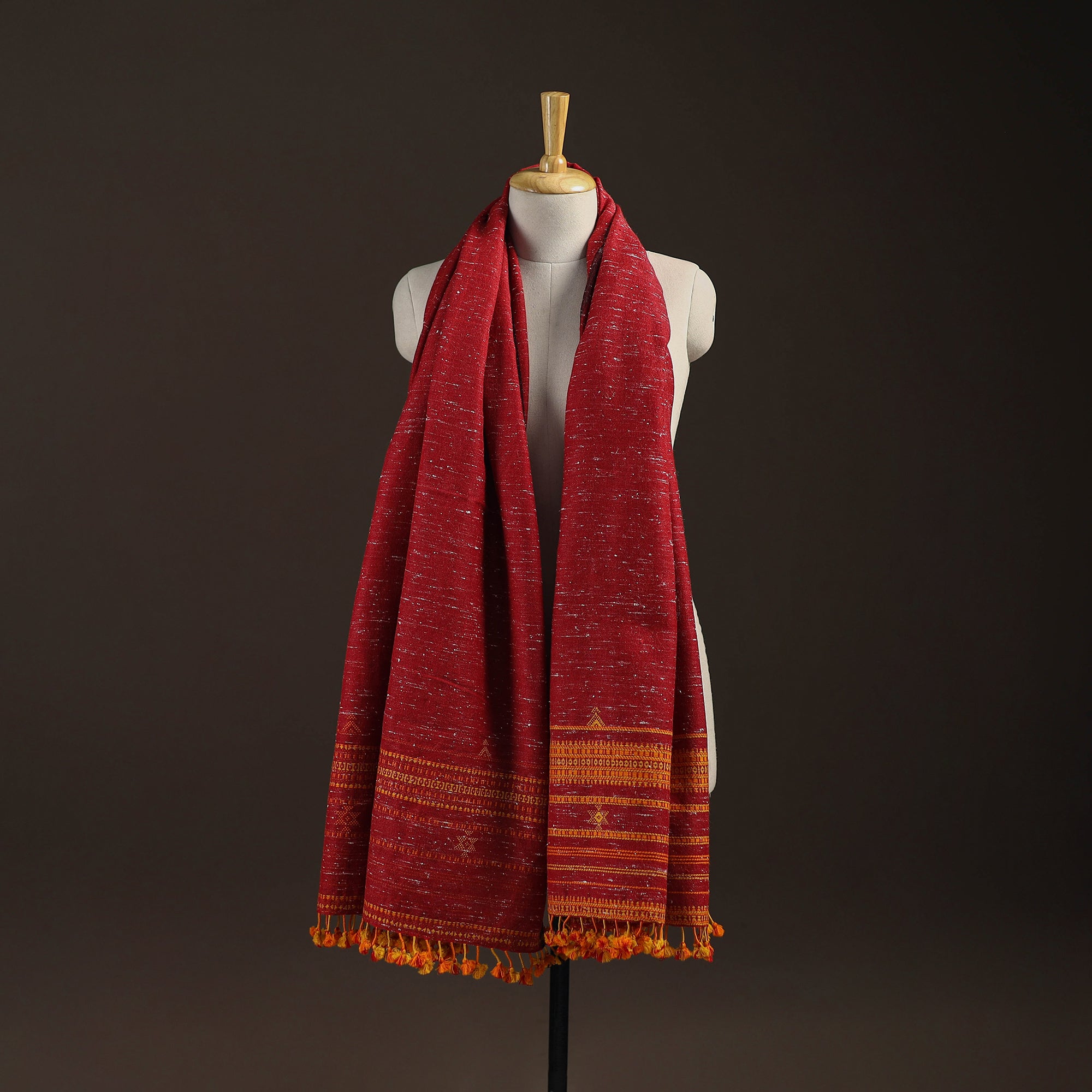Red bhujodi shawl handwoven by Vinay Siju in Bhuj, Gujarat. Designed with traditional Kutchi motifs and tassels. Made from merino wool to provide reliable warmth. A practical choice for everyday winter wear or outings.