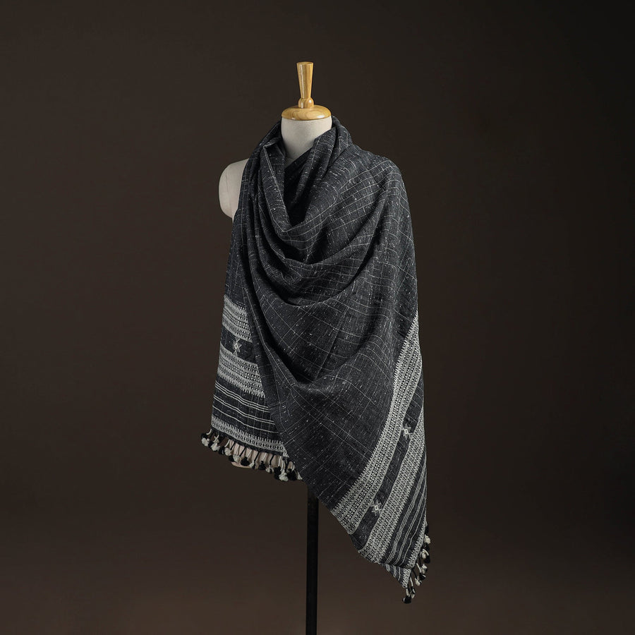 | Material | Black bhujodi shawl handwoven by Vinay Siju in Bhuj, Gujarat. Designed with traditional Kutchi motifs and tassels. Made from merino wool to provide reliable warmth. A practical choice for everyday winter wear or outings. |