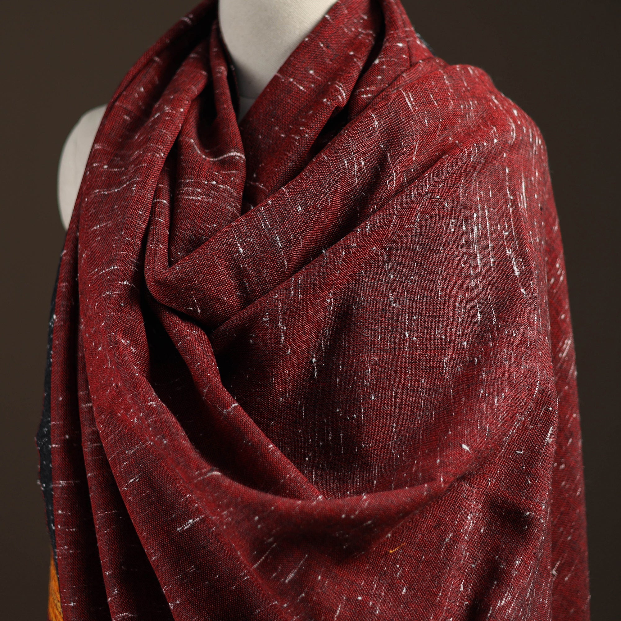 Bhujodi shawl handwoven by Vinay Siju in Bhuj, Gujarat. Designed with traditional Kutchi motifs and tassels. Made from merino wool to provide reliable warmth. A practical choice for everyday winter wear or outings.