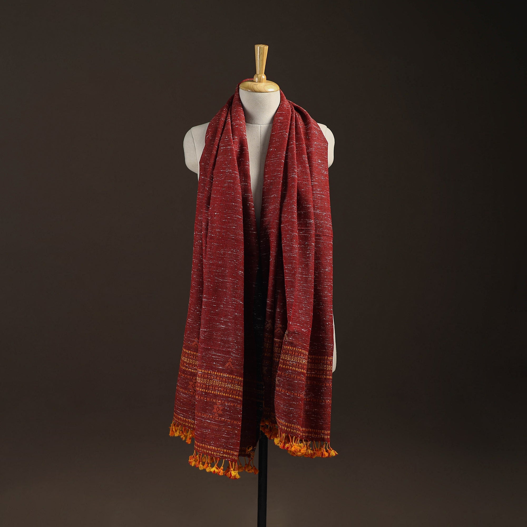 Red bhujodi shawl handwoven by Vinay Siju in Bhuj, Gujarat. Designed with traditional Kutchi motifs and tassels. Made from merino wool to provide reliable warmth. A practical choice for everyday winter wear or outings.