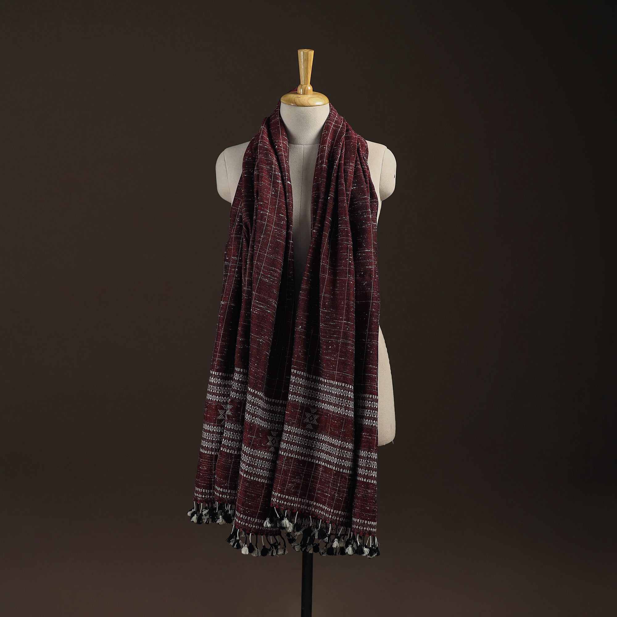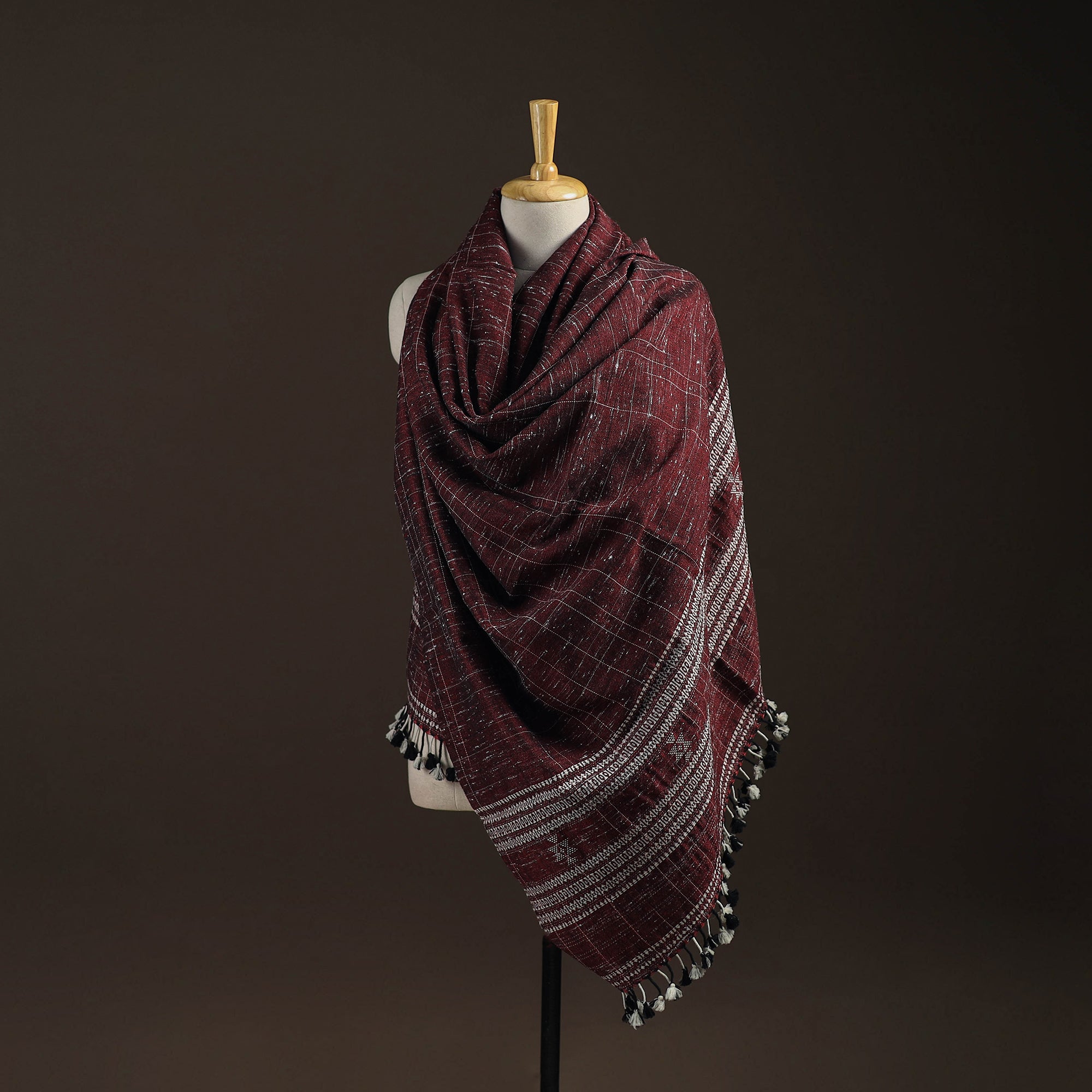 Maroon bhujodi shawl handwoven by Vinay Siju in Bhuj, Gujarat. Designed with traditional Kutchi motifs and tassels. Made from merino wool to provide reliable warmth. A practical choice for everyday winter wear or outings.