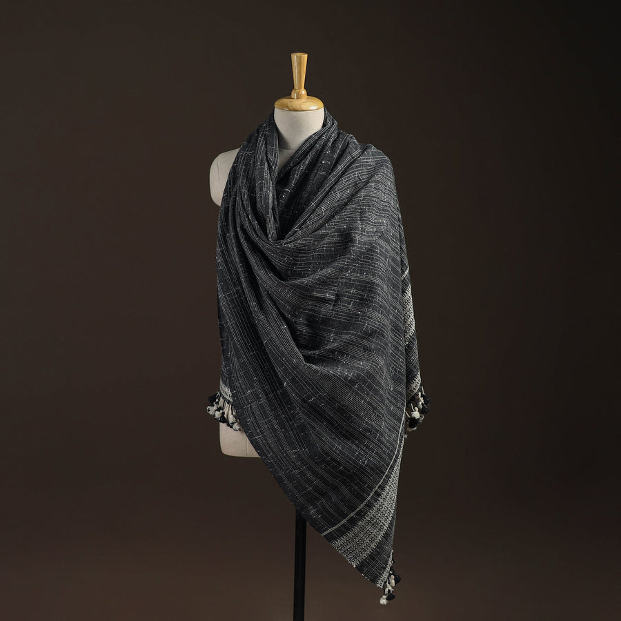 Black bhujodi shawl handwoven by Vinay Siju in Bhuj, Gujarat. Designed with traditional Kutchi motifs and tassels. Made from merino wool to provide reliable warmth. A practical choice for everyday winter wear or outings.