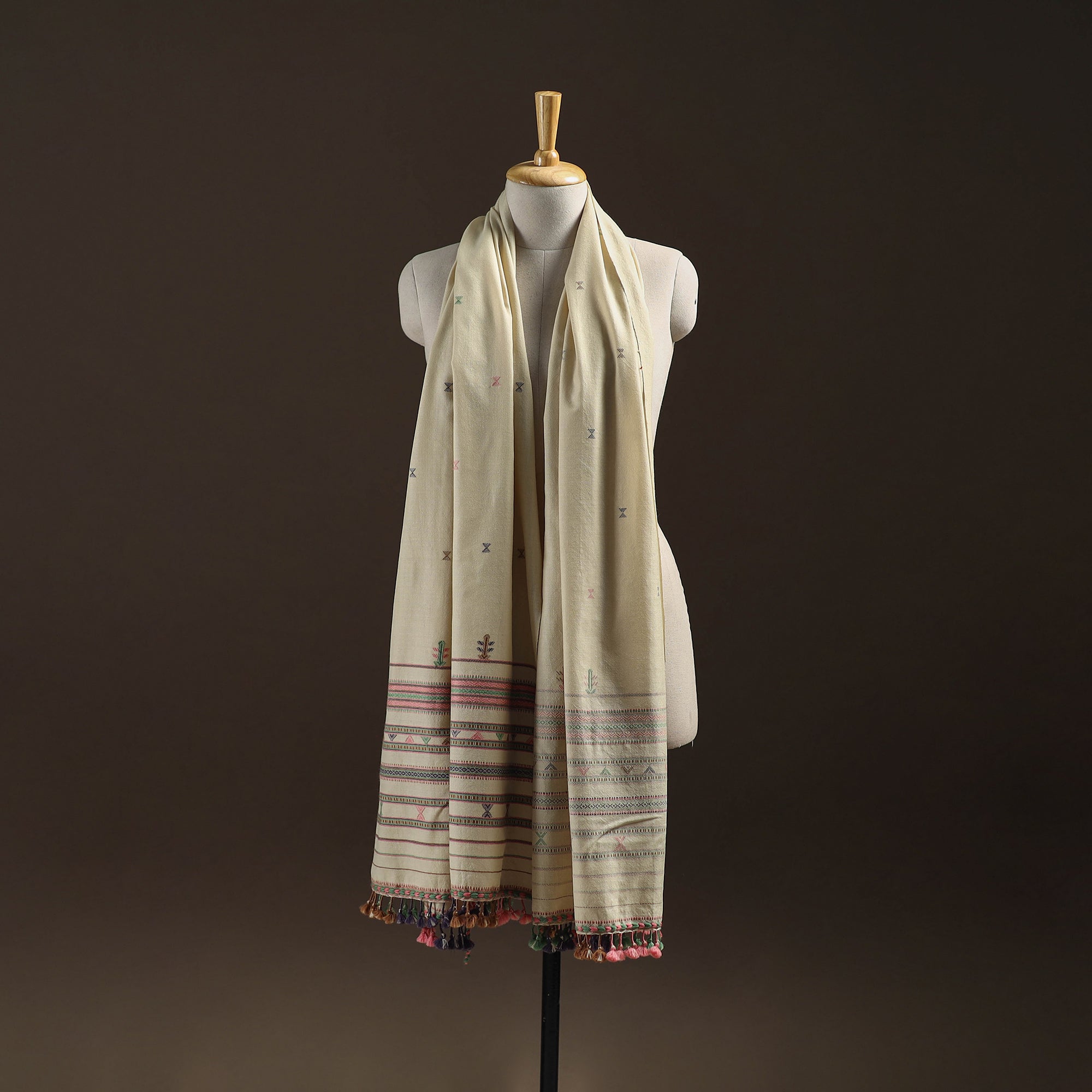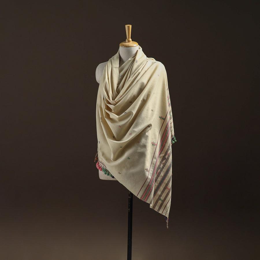 Kutch bhujodi handwoven shawl crafted by skilled artisan Vankar Bhimji Kanji from Bhuj Gujarat. Adorned with intricate Kutchi motifs and tassle. Made from merino wool it offers both warmth and comfort. A perfect blend of tradition and style ideal for daily winter wear.