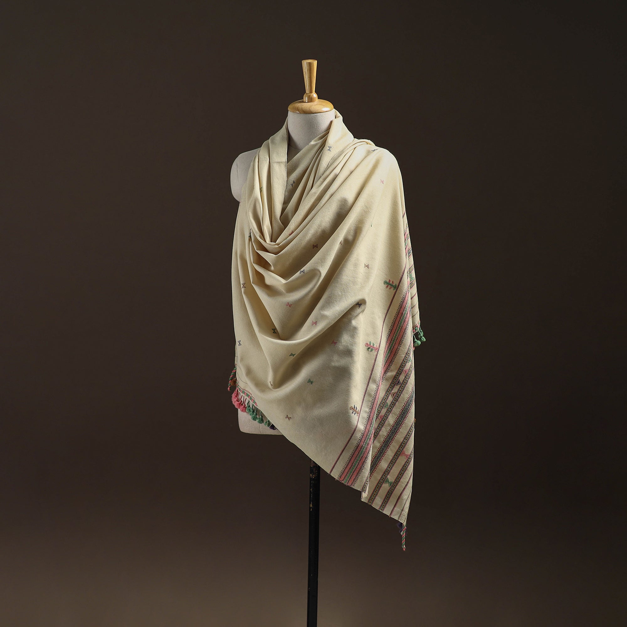 Beige kutch handwoven shawl crafted by skilled artisan Vankar Bhimji Kanji from Bhuj Gujarat. Adorned with intricate Kutchi motifs and tassle. Made from merino wool it offers both warmth and comfort. A perfect blend of tradition and style ideal for daily winter wear.