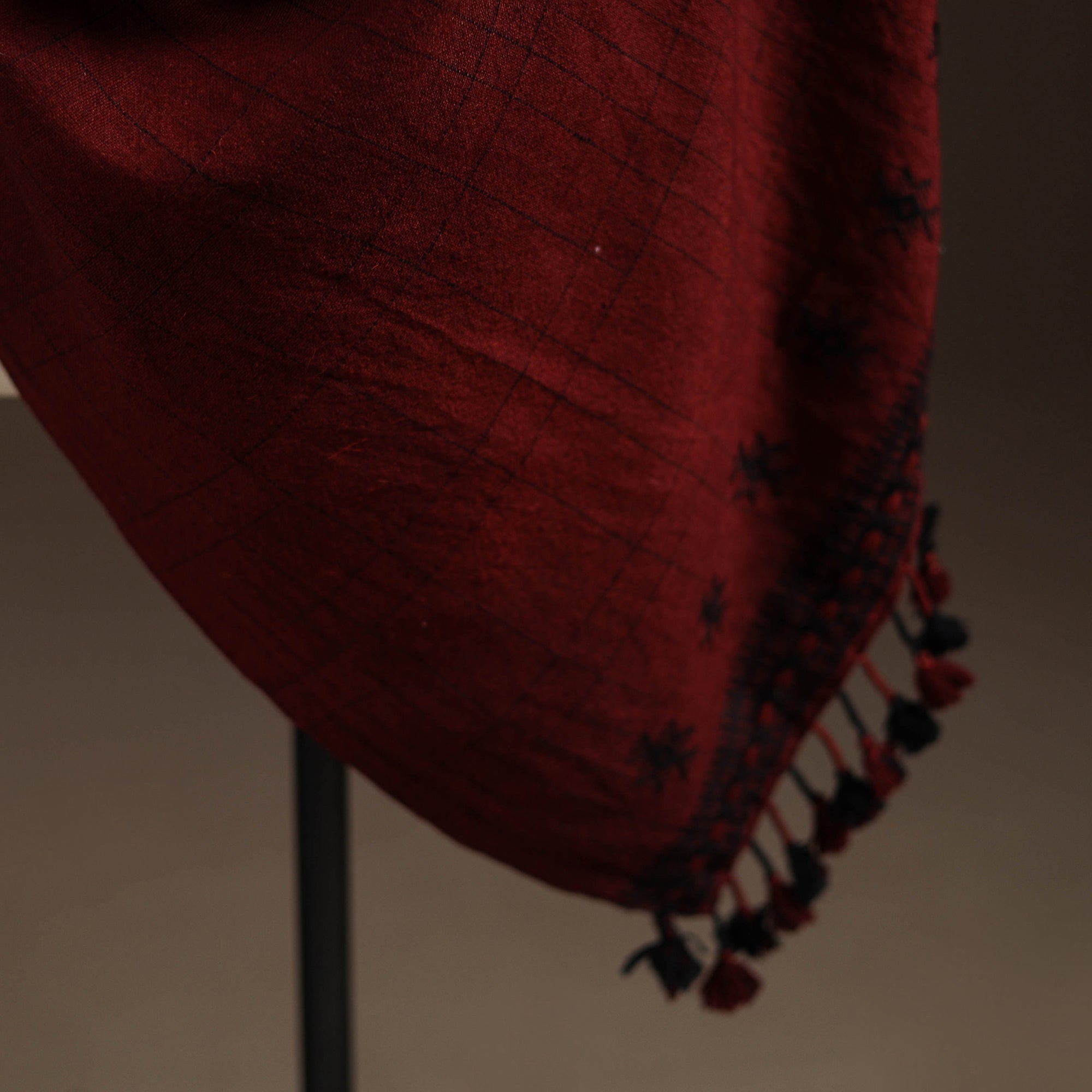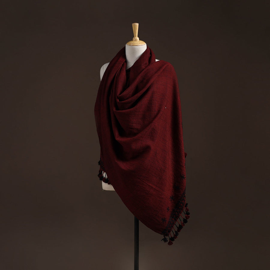 Bhujodi shawl handwoven by Vinay Siju in Bhuj, Gujarat. Designed with traditional Kutchi motifs and tassels. Made from merino wool to provide reliable warmth. A practical choice for everyday winter wear or outings.