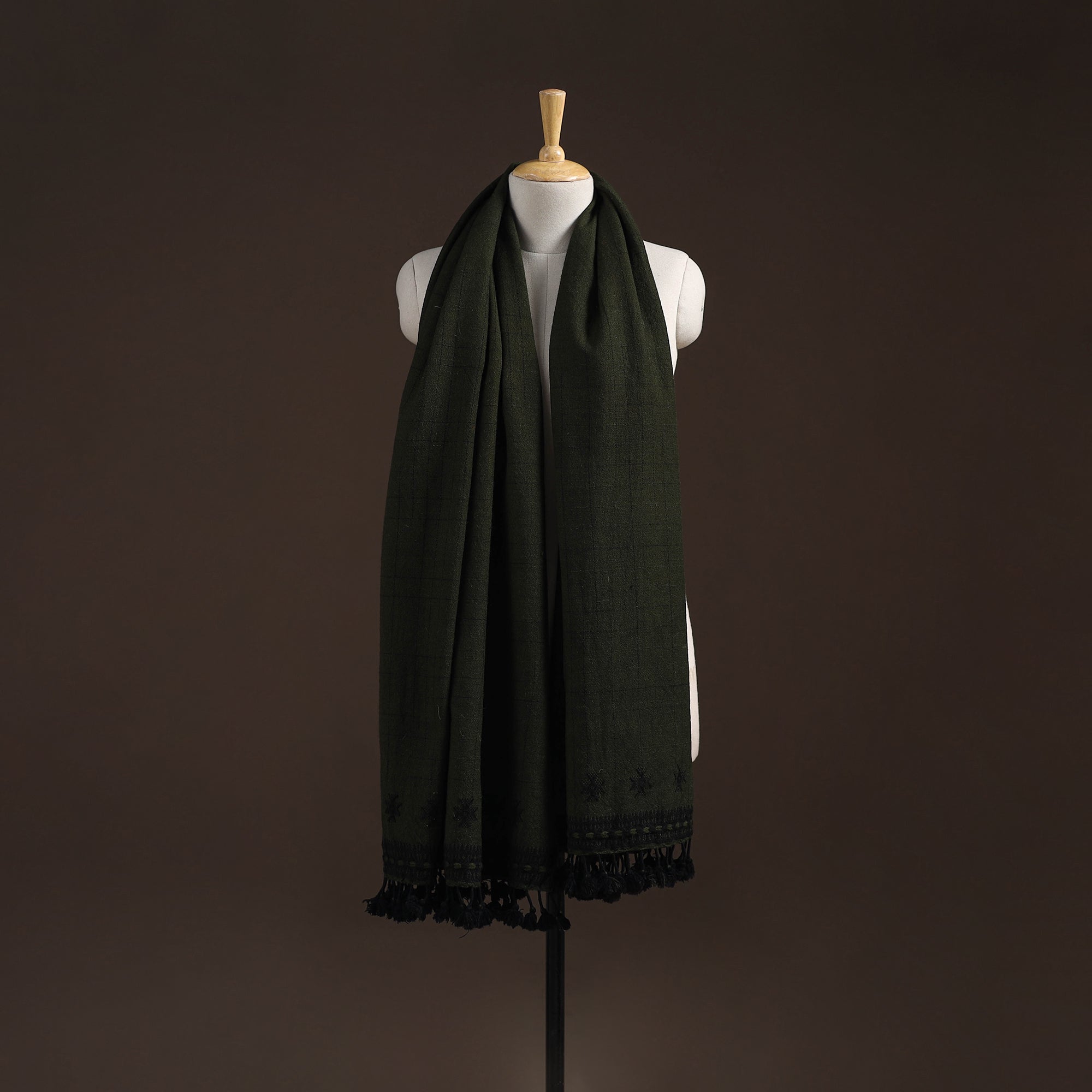 Bhujodi shawl handwoven by Vinay Siju in Bhuj, Gujarat. Designed with traditional Kutchi motifs and tassels. Made from merino wool to provide reliable warmth. A practical choice for everyday winter wear or outings.