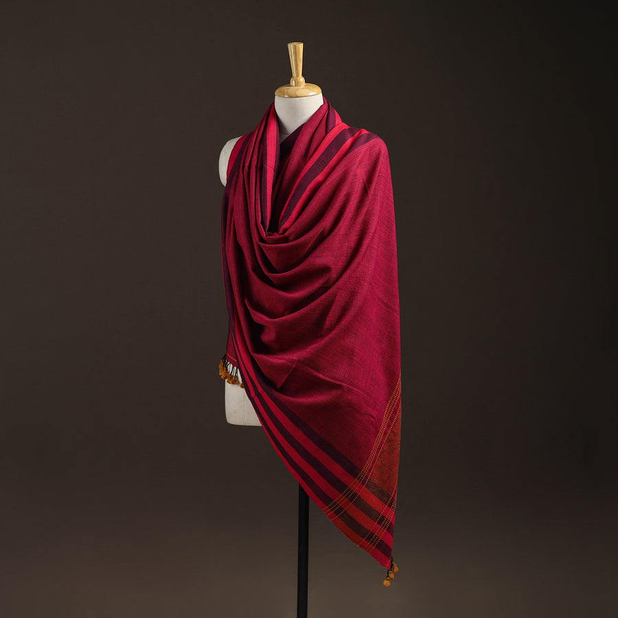 Bhujodi shawl handwoven by Vinay Siju in Bhuj, Gujarat. Designed with traditional Kutchi motifs and tassels. Made from merino wool to provide reliable warmth. A practical choice for everyday winter wear or outings.