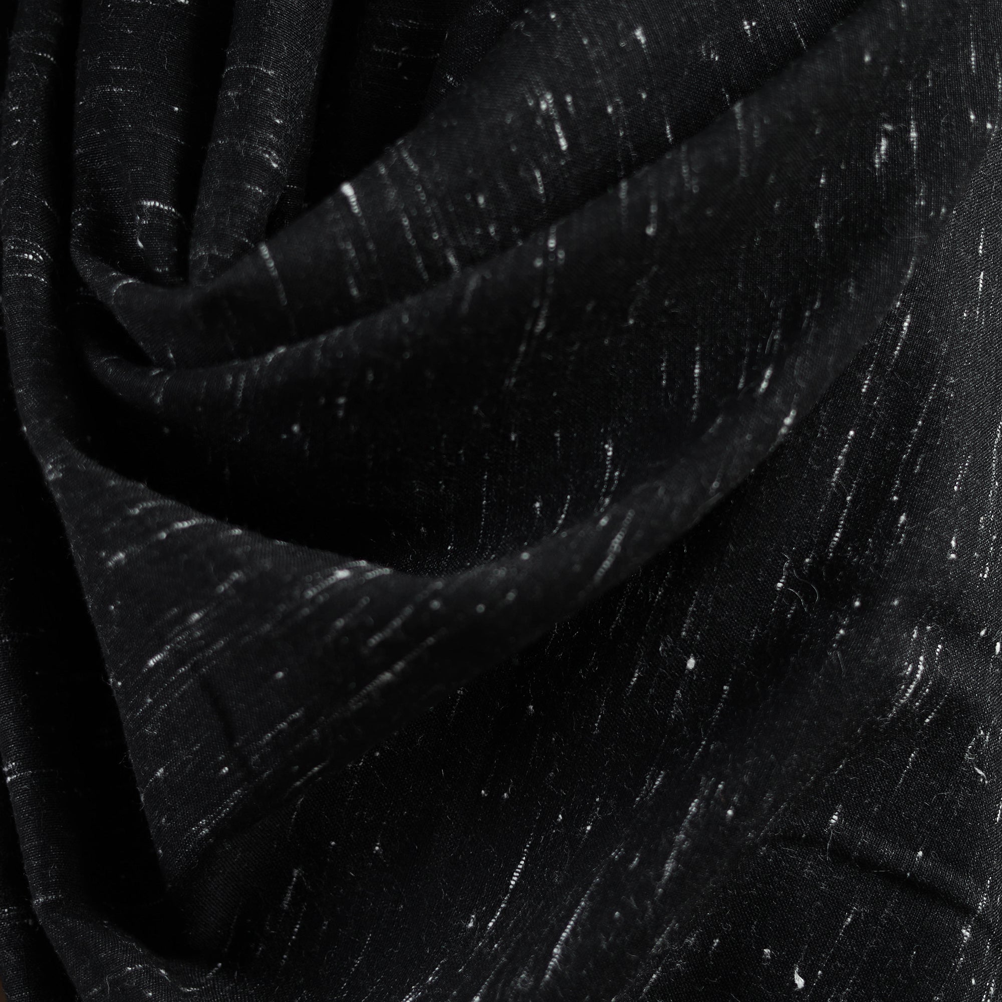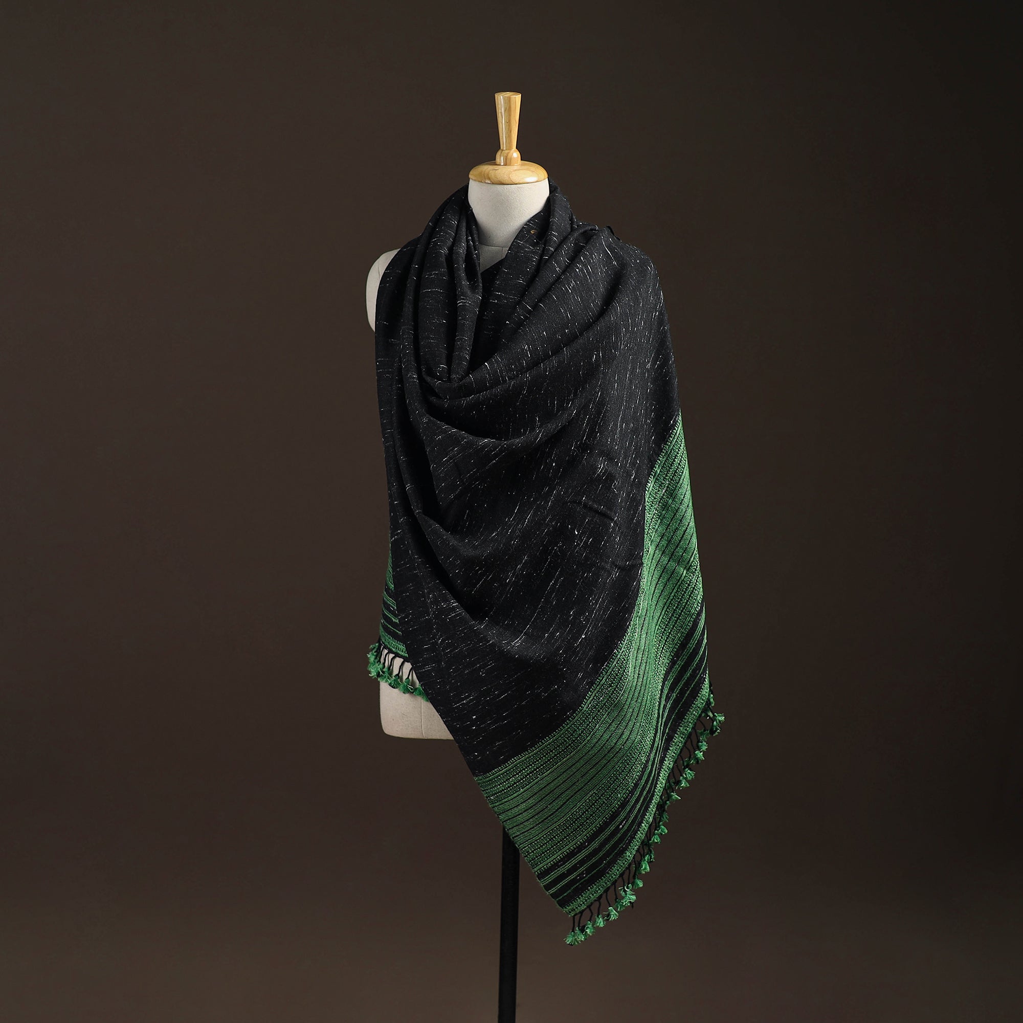 Black bhujodi shawl handwoven by Vinay Siju in Bhuj, Gujarat. Designed with traditional Kutchi motifs and tassels. Made from merino wool to provide reliable warmth. A practical choice for everyday winter wear or outings.