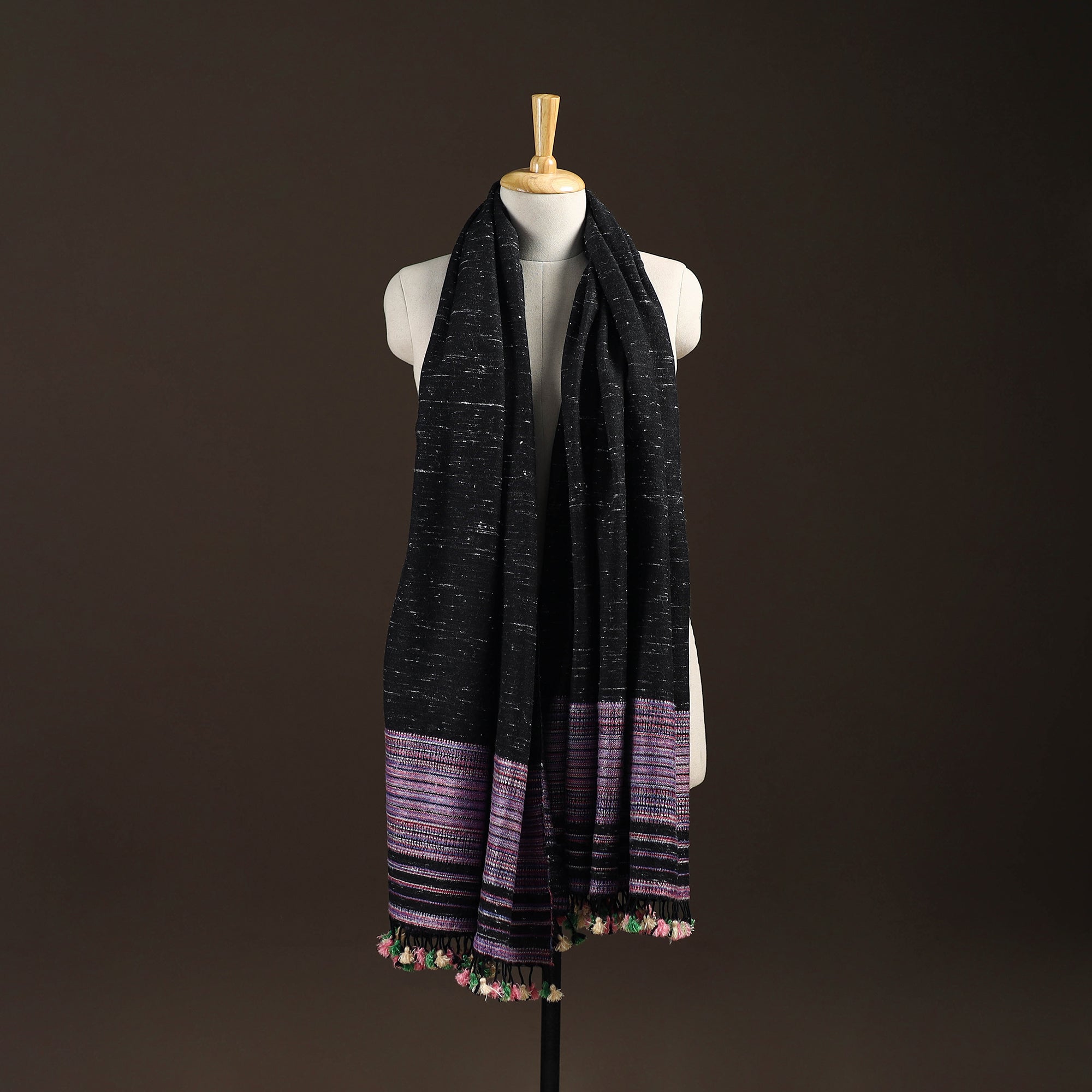Black bhujodi shawl handwoven by Vinay Siju in Bhuj, Gujarat. Designed with traditional Kutchi motifs and tassels. Made from merino wool to provide reliable warmth. A practical choice for everyday winter wear or outings.