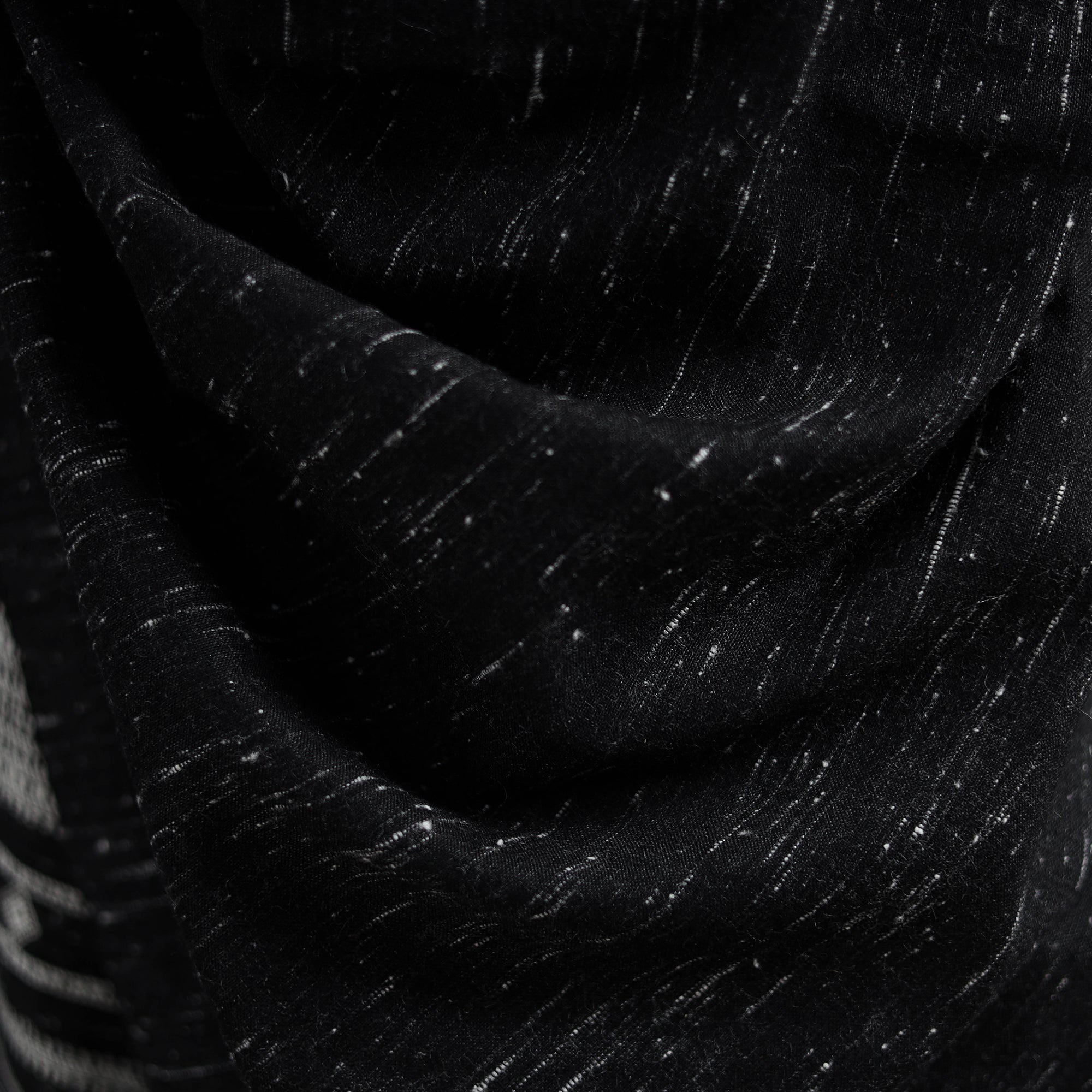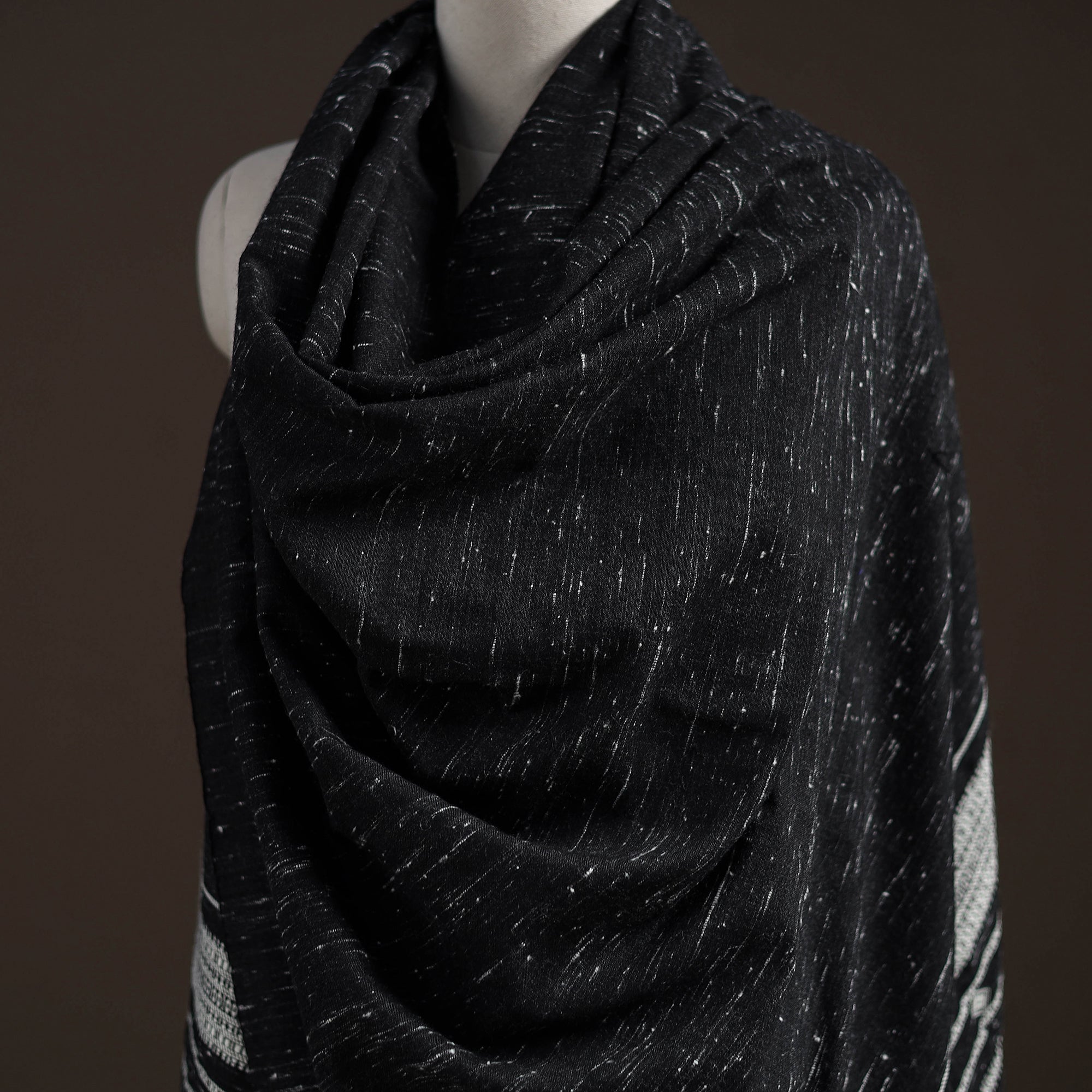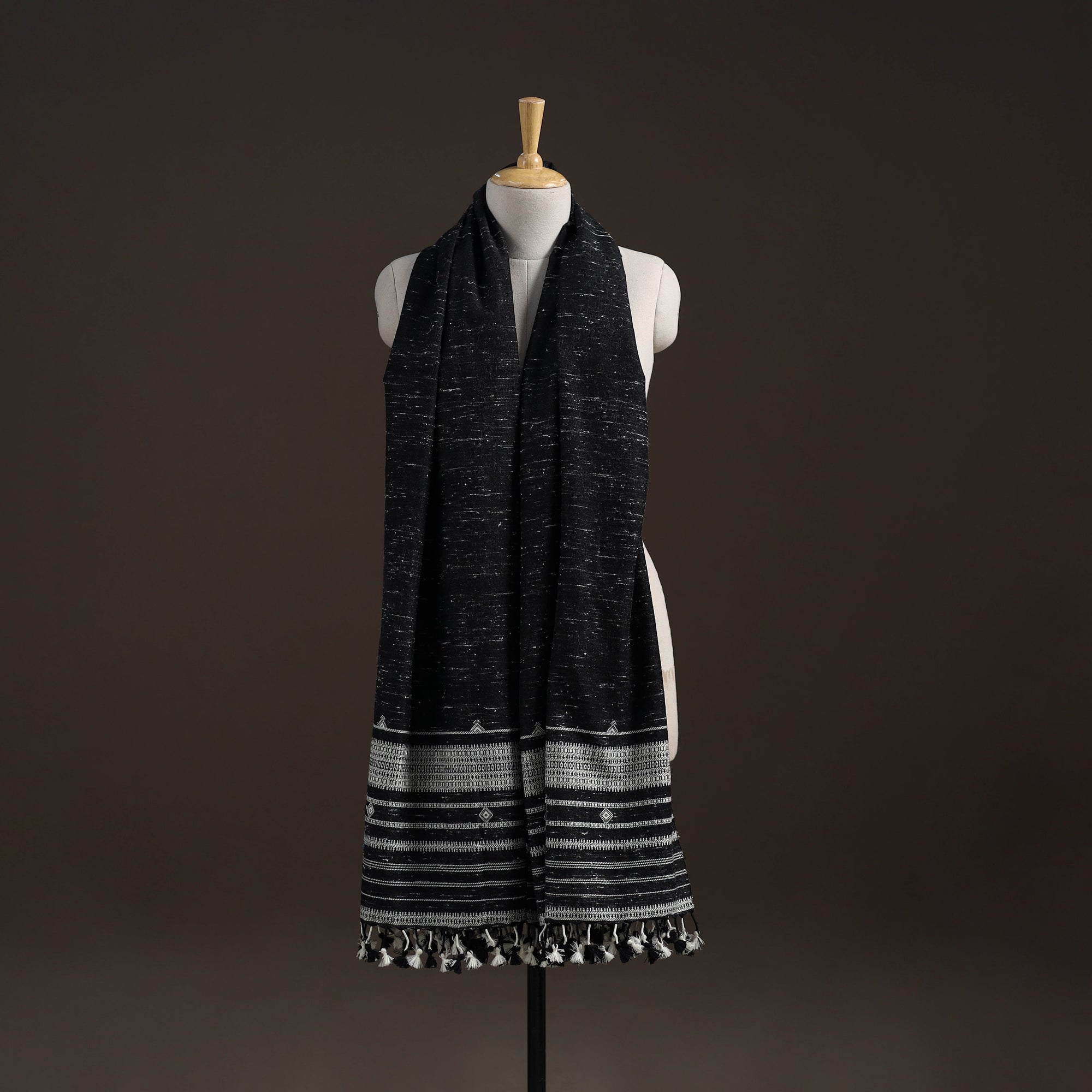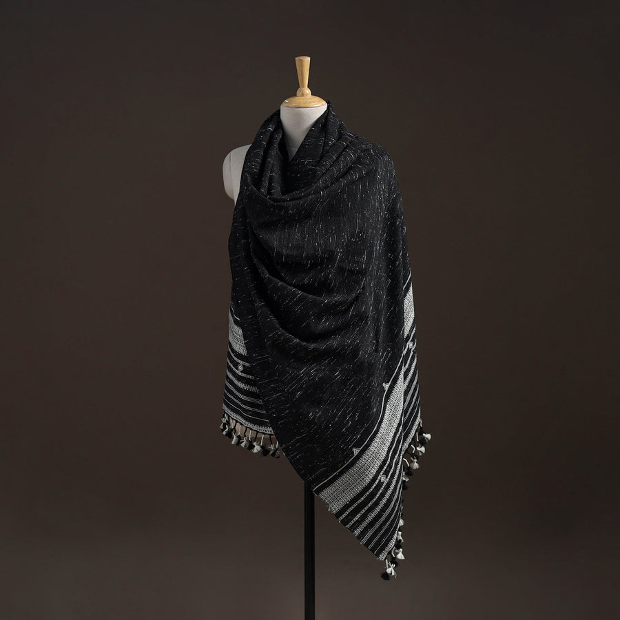 Bhujodi shawl handwoven by Vinay Siju in Bhuj, Gujarat. Designed with traditional Kutchi motifs and tassels. Made from merino wool to provide reliable warmth. A practical choice for everyday winter wear or outings.